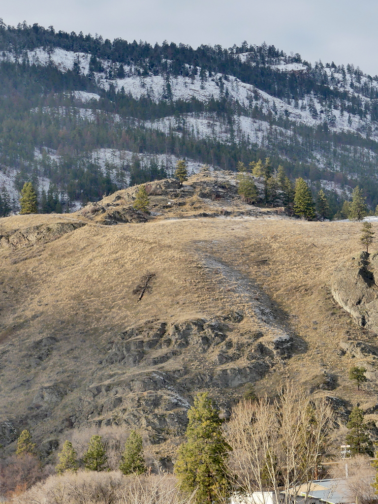 Winter light however, has revealed the land’s energies well. They serve as a map. Note the snake, or river, of bone (or stone) that the Earth thrusts up just under her skin and outlines in snow caught in shadow and so hidden from the winter sun. It runs from centre left to the middle of the image and then spills out in a series of broken steps back to the left. Above it is a ledge of grass. Let us know that as the lake of the sun. Above that is the cooler, wetter stone that has allowed trees to gather to it and delivers water to the sun’s lake and down through this fall of stone. That is one map of the Okanagan.