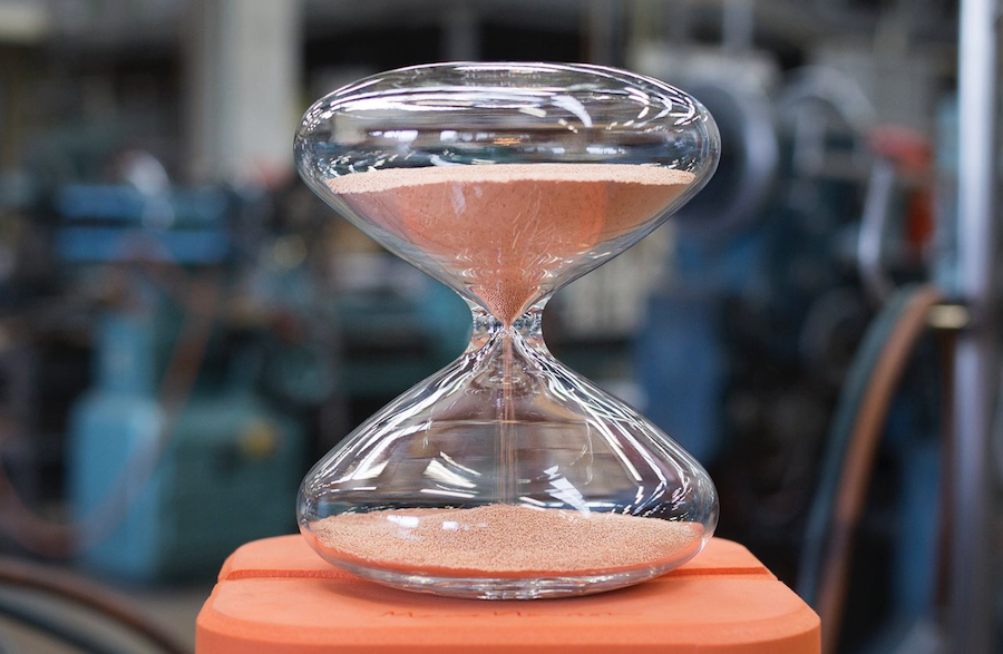 Note how that below this hourglass, the shape repeats itself. This time, the head on the left is that of a grizzly bear, while the one on the right is of a man with some other animal, a beaver or a marmot, forming his head and looking to the right. This time, the sand narrows, falls, then fans out again over ledges of stone.