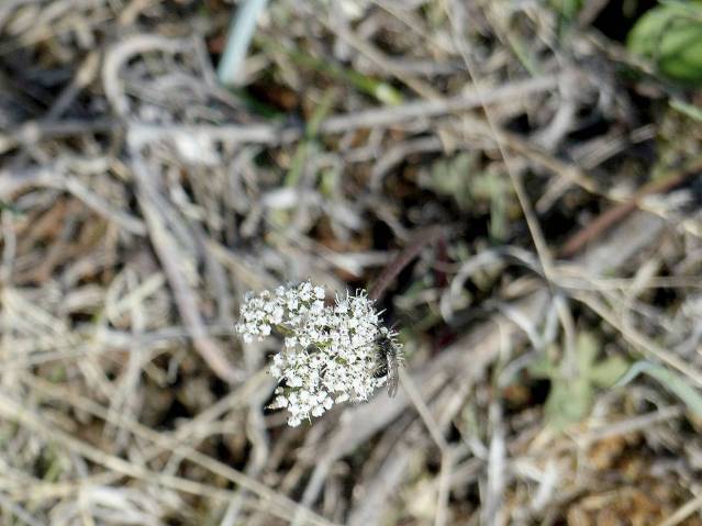 Yes, there is narrative in the desert parsley below, and we can use the understandings of linearly-oriented English to explain how the visiting wasp is interacting with this flower, but for all of that smartness and power, the real point is lost.