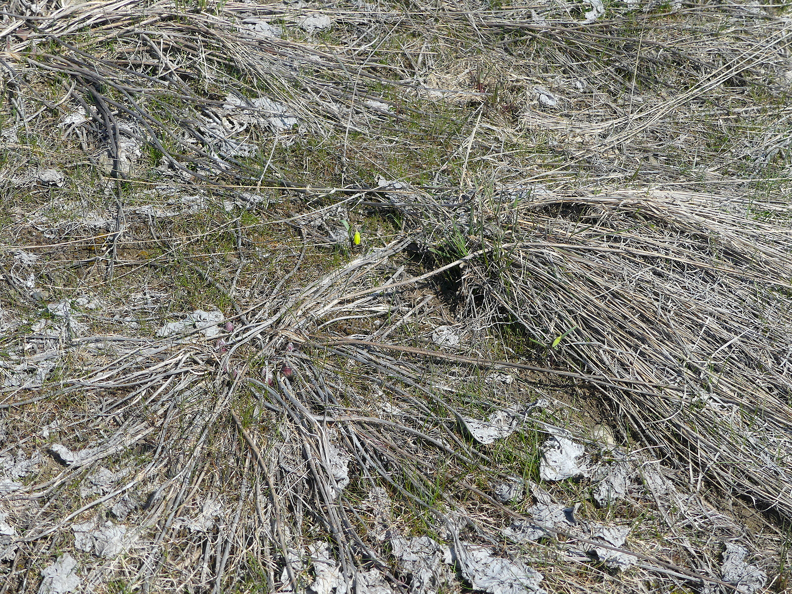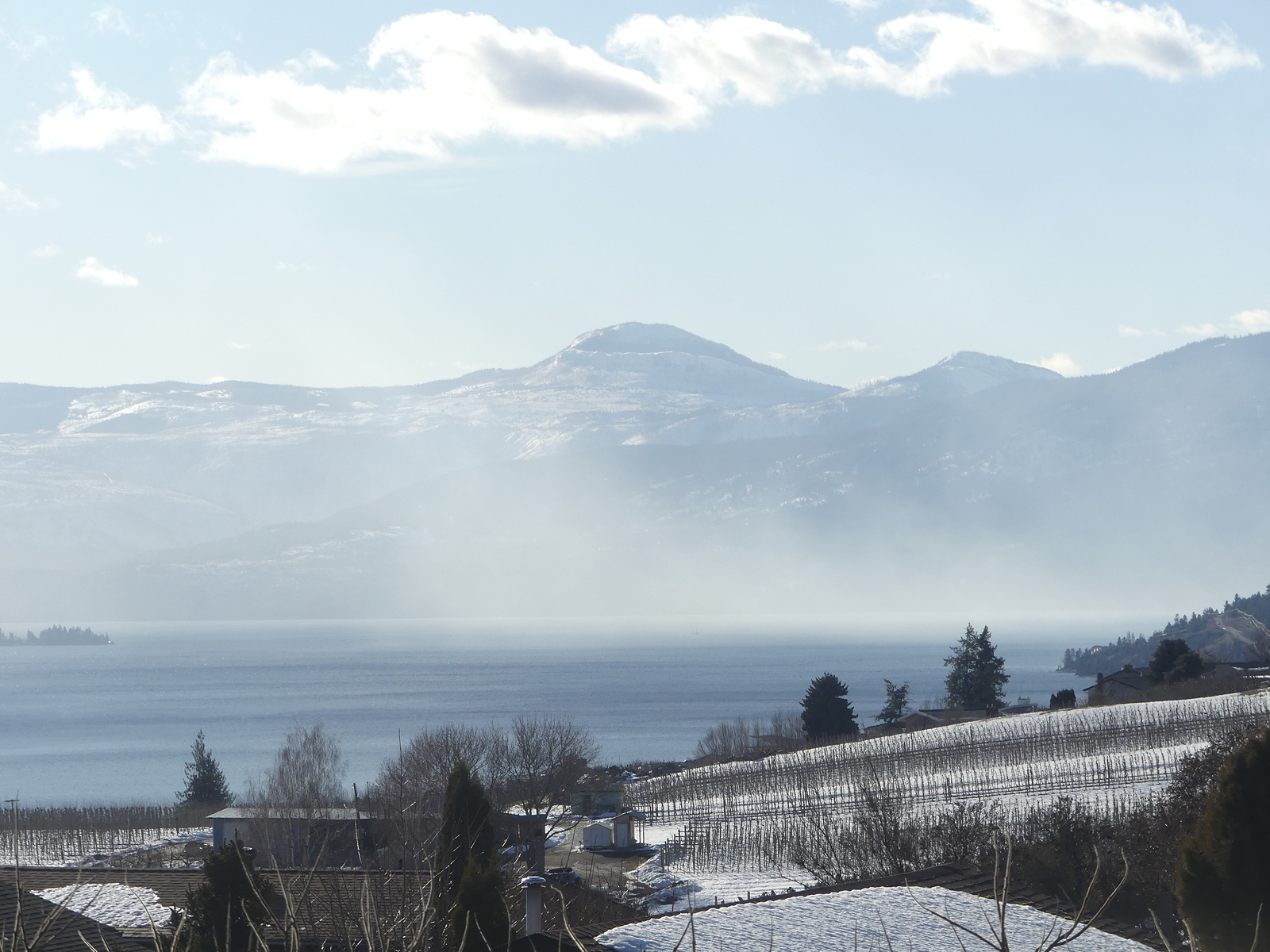 That’s “lake mist”, a recent settler to the valley told me. “It’s perfectly natural.” No, it’s not. It’s art, and art, applied to the Earth, is an industrial undertaking rather than an aesthetic one. Again, this can be a good thing. After all, the balsam root sprouts (purple, in the foreground) and the last remaining yellow bells of the old syilx land sense below, two self-replicating and self-sustaining food crops …
