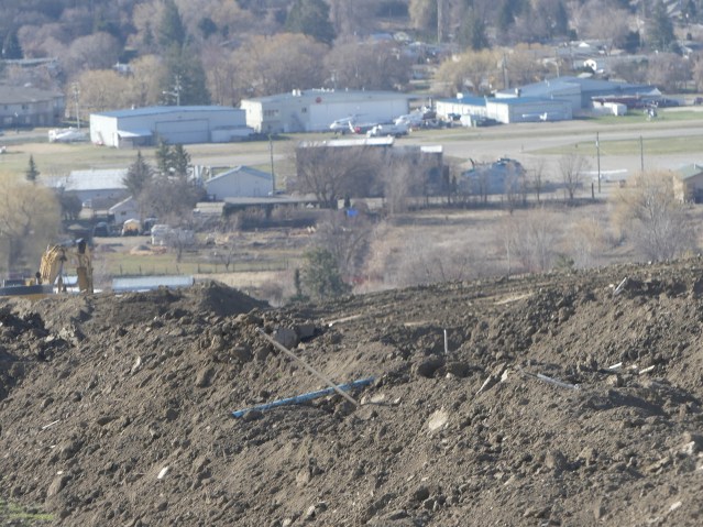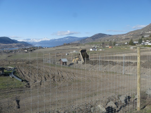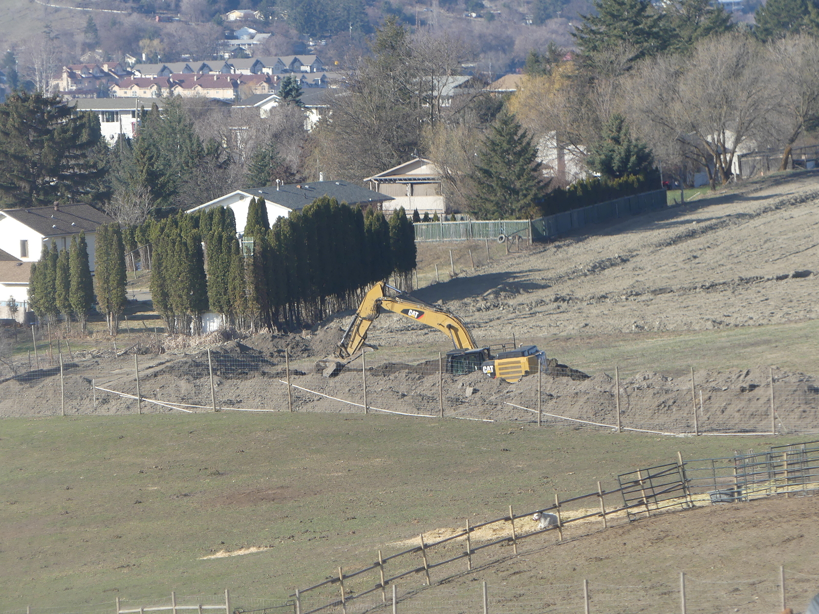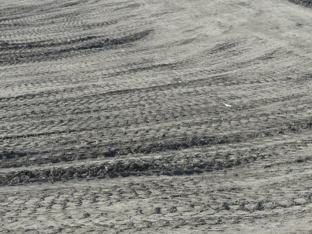 … is somehow farming, or family farming, or that we are growing past it with a push towards organic farming, or de-industrialized agriculture, well, it’s over. The technology of the oil patch has arrived. Here’s Coyote’s field now. All the soil has been scraped up and piled up in a mountain, the underlying clay has been spread out, without the rolling hills that tie us to geological history, and the soil will soon be spread back out, making it more usable by machines.