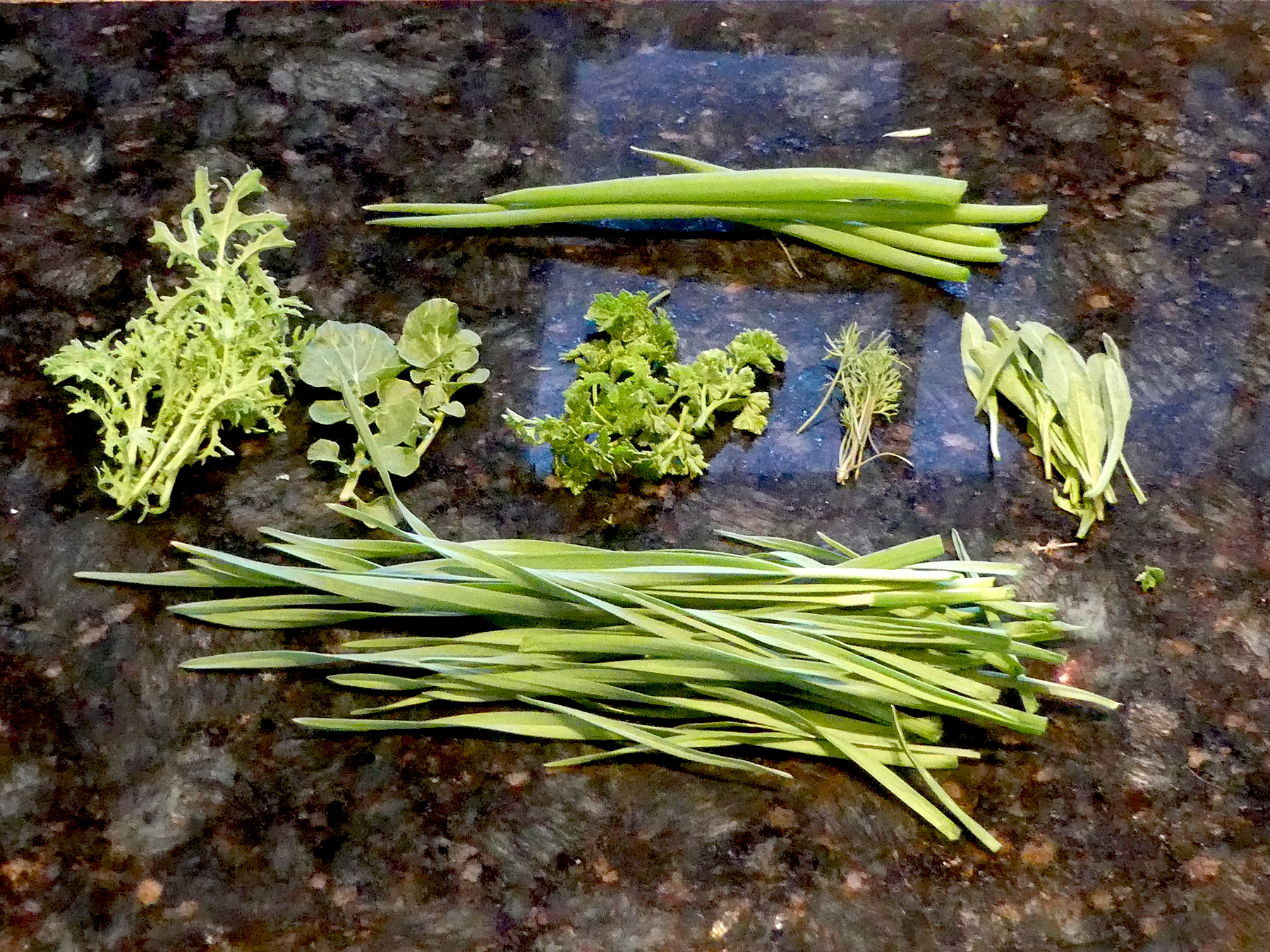 From left to right: spicy mustard, upland cress, parsley, dill, wild arugula.
