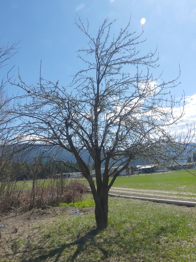 This old apple tree was chopped back to stubs something around ten years ago, and then let grow out. When I came to her, she was so dense you couldn’t see through her, but gorgeous and perfect in shape. Still, only her outside apples were sweet, so we decided to bring her back to a shape that fit with human bodies, as well as her own. The first step was to purify her shape. That’s what you see below. I took out about 40% of the branches, very carefully, so the tree’s balance and dominance remained and every root had leading buds, in perfectly balanced dominance, to work with them to feed the tree.