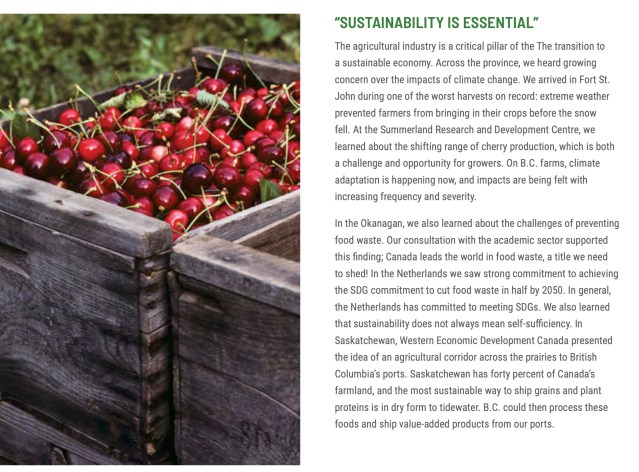 This image from the food sustainability report is attractive. It shows bright red cherries in quaint, traditional boxes, in an argument for innovation during climate change. That there is more that can be done to combat climate change in the Okanagan Valley mentioned in the text than passively reacting to changing weather patterns due to atmospheric carbon, is not mentioned. That these cherries are immature and picked in haste is not mentioned. That cherries are largely grown in huge industrial plantations today, pumped up with hormones to make them extra firm to go over graders and extra large to demand a luxury price in Asia, picked into plastic crates and sorted in large packing plants, is not mentioned, and what, in the end, is the message of the text attached to this image? Food waste! So, look at those cherries. The carelessness of this picking, and the poor agricultural and marketing practices behind it …