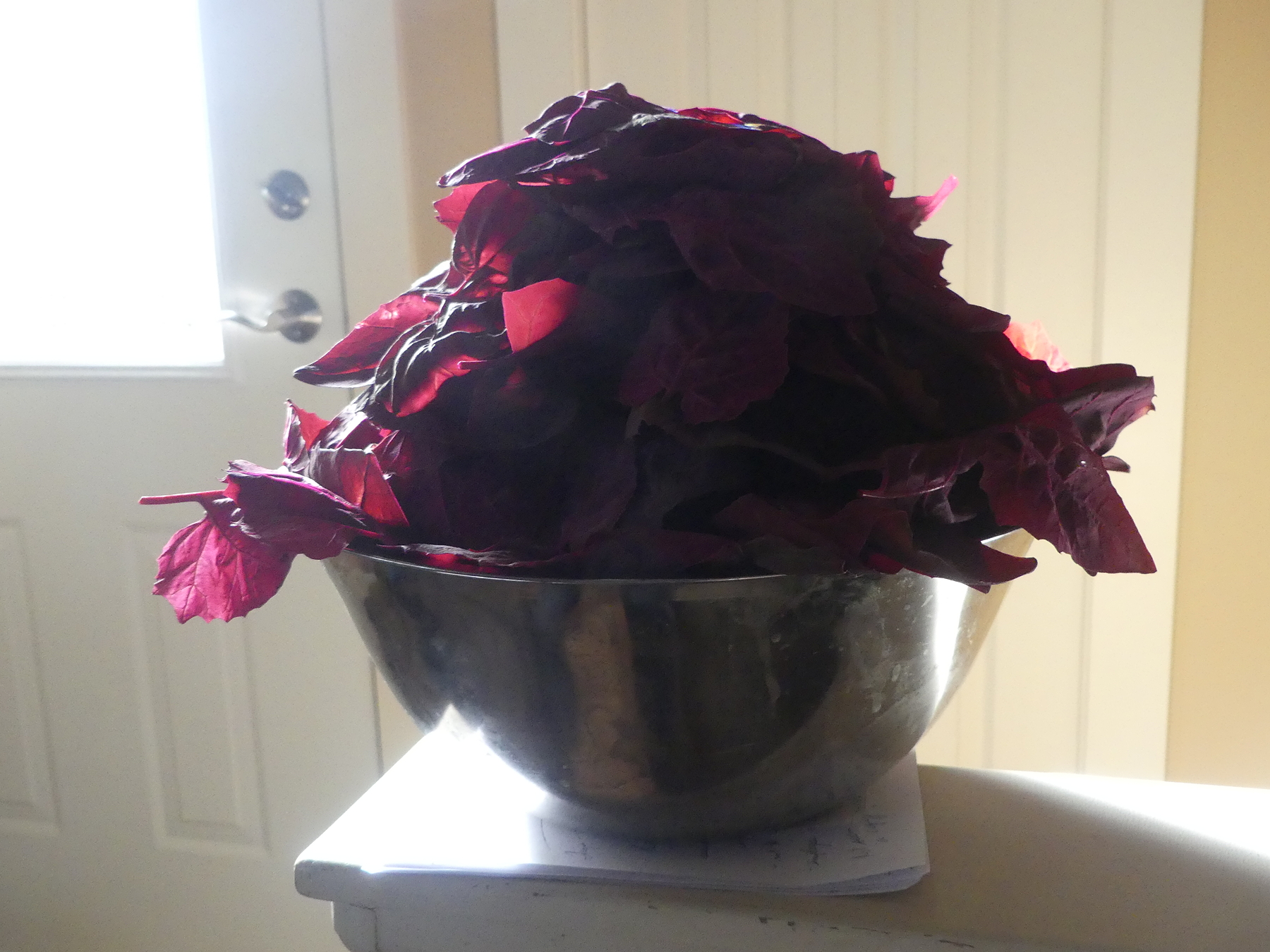 This is a waste. What’s more, we can grow apples in other zones, where water loss is not an issue, we can grow other products than grapes to make alcohol, and as for the genetic manipulation of foodstuffs to support sustainability, that is not only slavery and theft of the great indigenous crops of the entire northern hemisphere. It also supports the continuation of settler culture by supporting industrial packing, distribution and sale of fruit, with the huge costs that it entails. Tomorrow, I will bring together the posts on this blog which have already addressed these issues, and after that I will compile a compendium of my posts on alternate forms of sustainability, ones that will allow sustainability in food and betterment of human and social relationships, without all this slavery and bondage. We are not helpless in the face of documents like this. We can champion the Earth without fear. Right, orach. Here’s my second harvest from 45 feet of row. If packaged and sold in a store, it would fetch $120 in net wholesale profit, after labour, packaging, seed and water are paid for. There are other costs, of course, but, still.