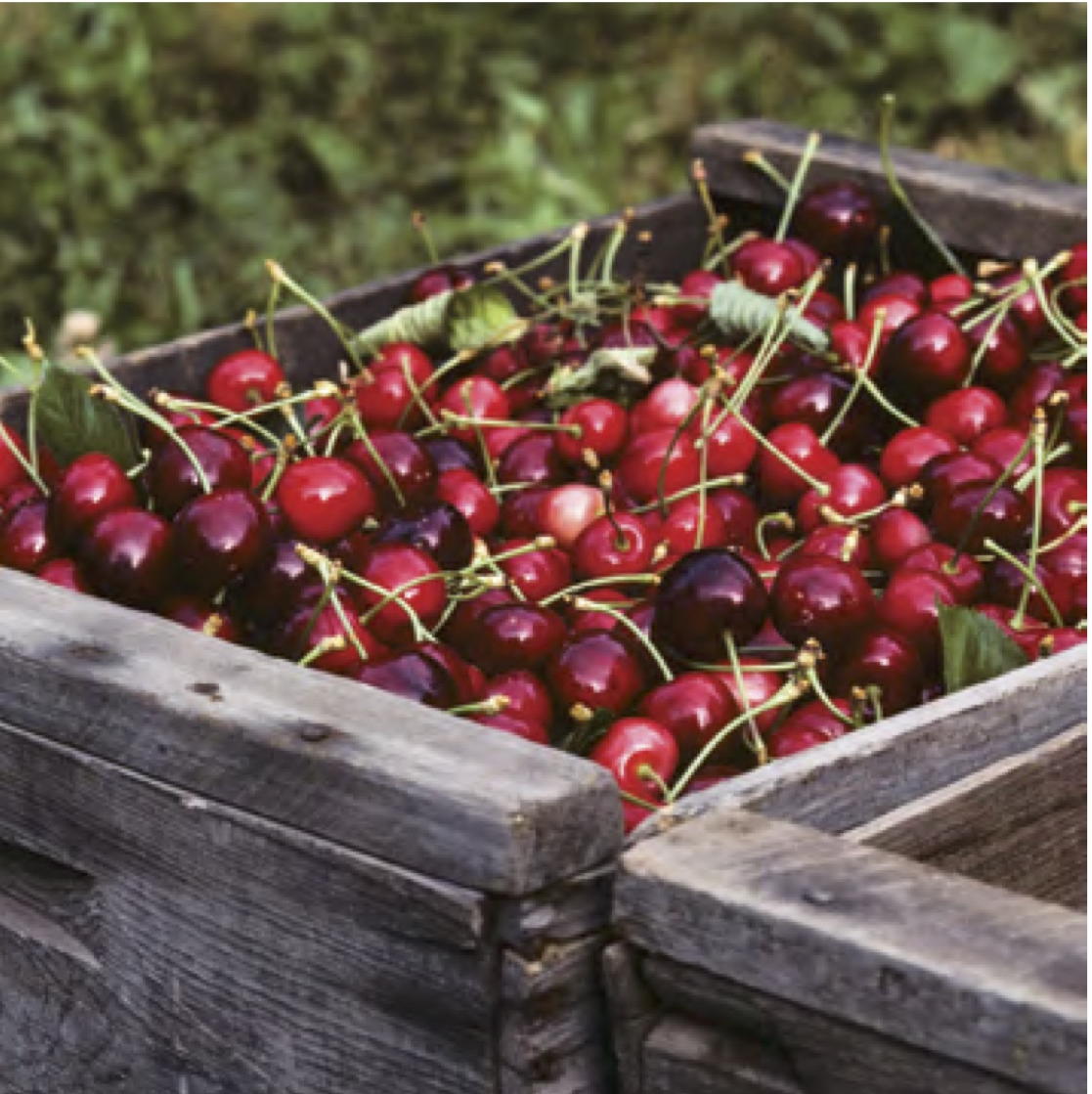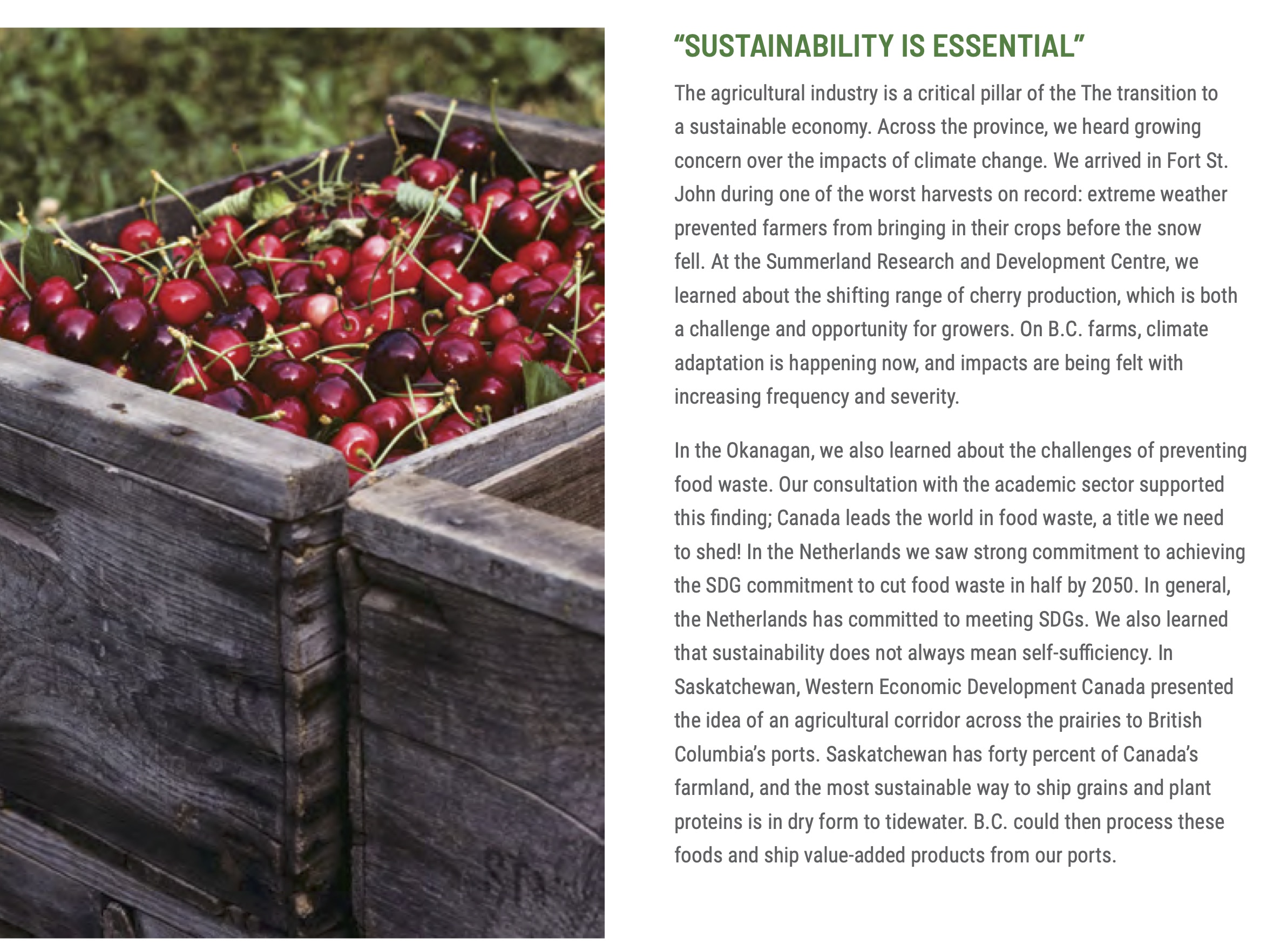 This image from the food sustainability report is attractive. It shows bright red cherries in quaint, traditional boxes, in an argument for innovation during climate change. That there is more that can be done to combat climate change in the Okanagan Valley mentioned in the text than passively reacting to changing weather patterns due to atmospheric carbon, is not mentioned. That these cherries are immature and picked in haste is not mentioned. That cherries are largely grown in huge industrial plantations today, pumped up with hormones to make them extra firm to go over graders and extra large to demand a luxury price in Asia, picked into plastic crates and sorted in large packing plants, is not mentioned, and what, in the end, is the message of the text attached to this image? Food waste! So, look at those cherries. The carelessness of this picking, and the poor agricultural and marketing practices behind it …
