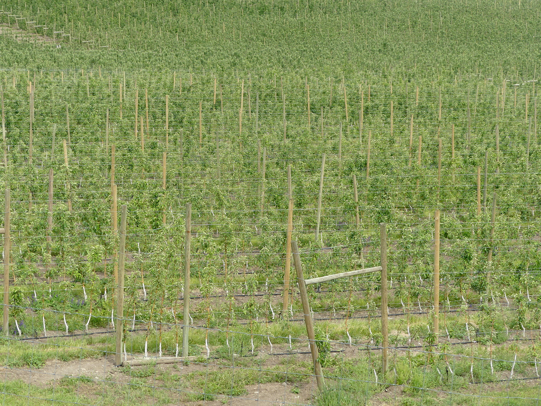 We don’t have to grow apples in the heat of the valley, where 35% of water applied to them evaporates, and we don’t have to subsidize agriculture in order to make it more efficient. This young orchard below was subsidized. At three years of age, these trees are junk. They should be torn out. Farming is about skill, but the entry level into farming is only money. The skill might be lacking, as it is below.