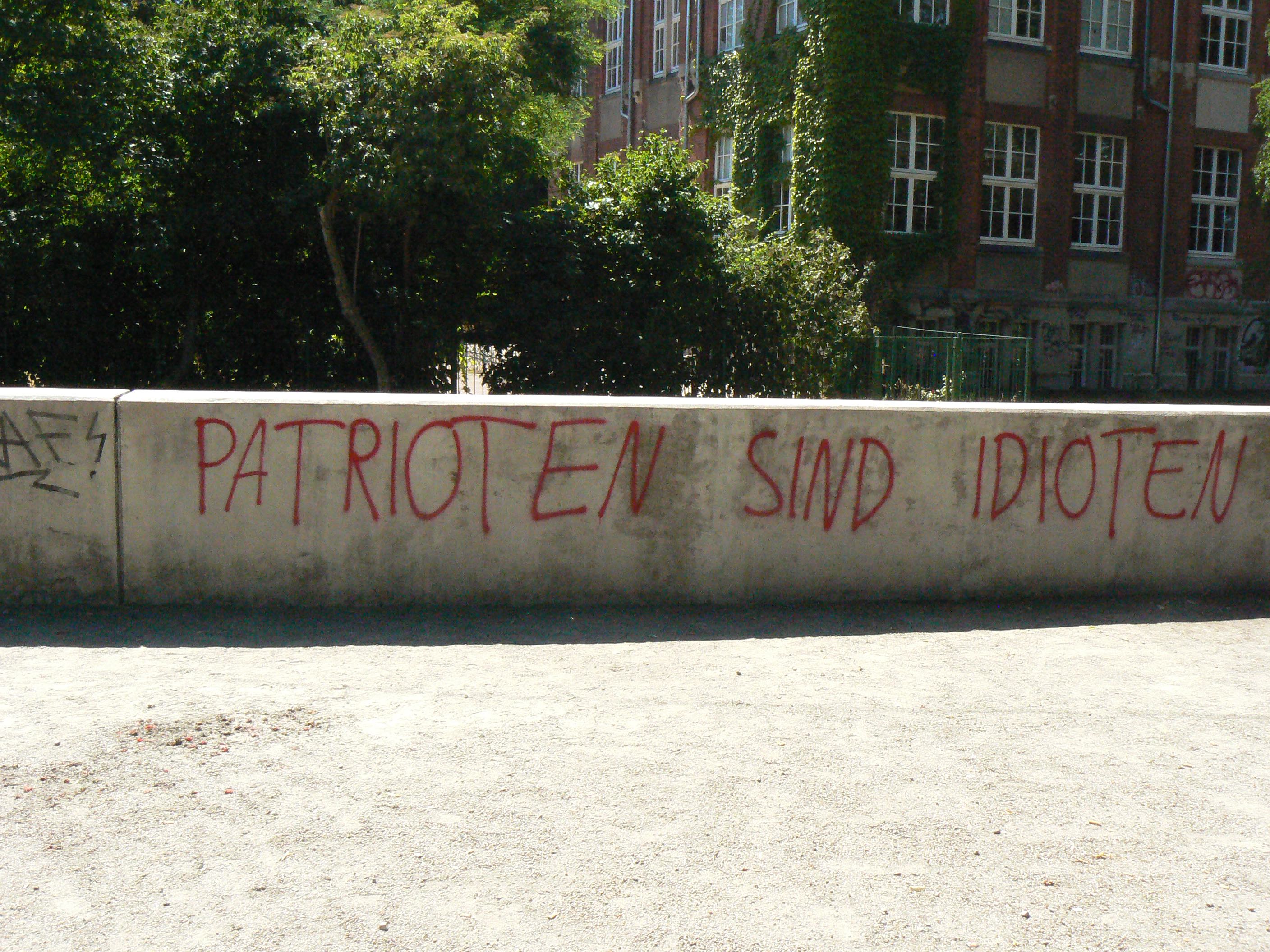 By the way, this is an Anti-Nazi slogan, despite its violence. You can tell because it has not been painted over, and because only democrats and Neo-Nazis are patriots. It is lumping democrats and Neo-Nazis in one camp.