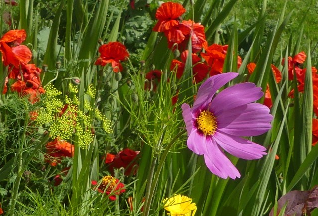 When harvest season starts in the snow in late February, with crops planted in mid-August the year before, the valley’s true seasons reveal themselves quite simply. Spring, for instance, took place in the fall, and lingered under the snow, to bring the first harvests from February through April. During this season, onions, spinach, lettuce, cilantro, arugula, parsley, rhubarb, kale, garlic chives and early thyme and sage graced the table, while peas, beans, cabbages, and herbs were under way. By the end of spring in early April, most of these crops were finished, except for a new crop of onions. Then summer came, throughout April, May and June, leading from heat to wet and then onward to mixed heat and wet. Strawberries came, new onions came on, the mustards were done, but basils were here, the rhubarb continued and the first potatoes and carrots came onto our plates. The peas came on richly, and the last spinach was done. The orach continued on, joyously. Now it is early fall. The strawberries are at their end, but the raspberries are beginning, and look, harvest is everywhere. A harvest of colour, soon to go to seed, for instance.