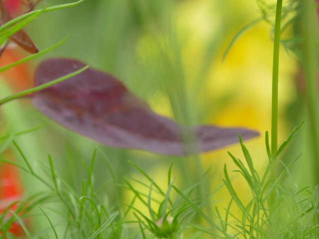 Tomatoes hate this approach, but, as you can see, red orach is happy with its companions, the glads and the cosmos.