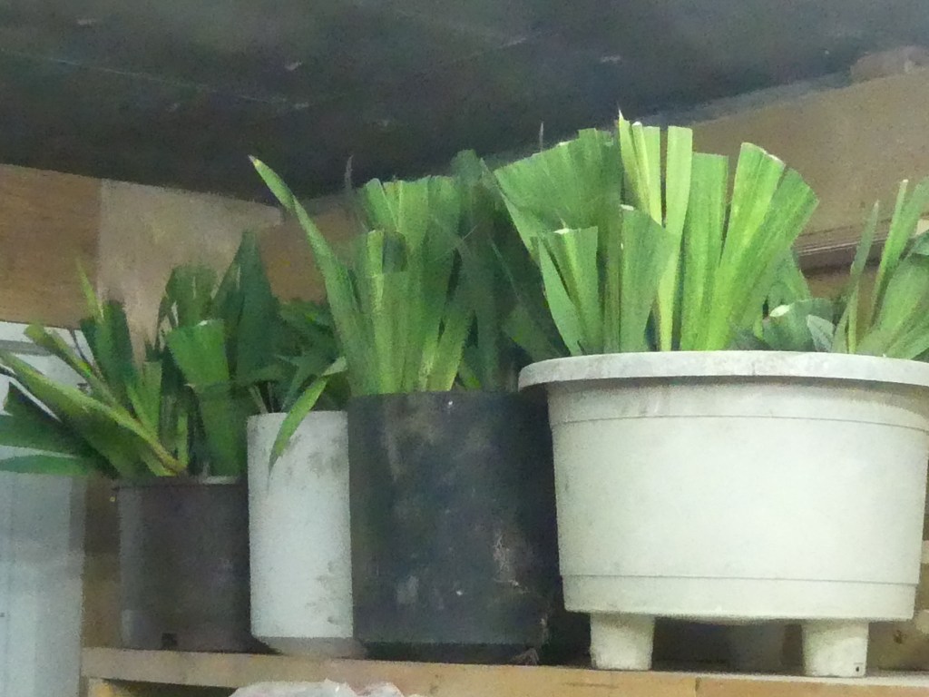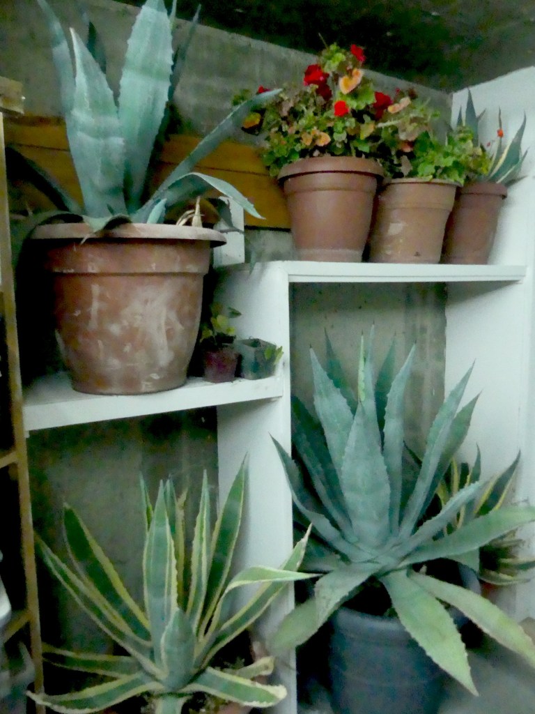 Brand new shelves. For scale, the big cubicle is four feet wide and five feet tall. The top pot on the left weighs around 90 pounds. Ooomph. I built a Jenga-style ladder of 2x4s and black widow spiders (!) to get it up there.
