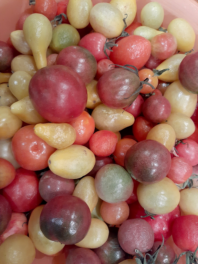 I deviated from Ricardo’s instructions and flavoured it with a red onion, a red clove of garlic, Winter Savoury, Sage and dried Basil. The flavour was very close to Ricardo’s, but that’s not the most exciting part. These small tomatoes, so sugary in the summer, harvested very late after weeks of cool, even cold, weather, and ripened cold and very slowly, had a complex flavour, no longer suitable for fresh eating, but wondrous in the pot. What’s more, in the summer, sauce from these little guys is very watery and doesn’t thicken, but this sauce came out very thick, without boiling down, with, remarkably, a real fresh summer tomato flavour. What an amazing discovery! (ps, I blended them before putting them on the stove.)