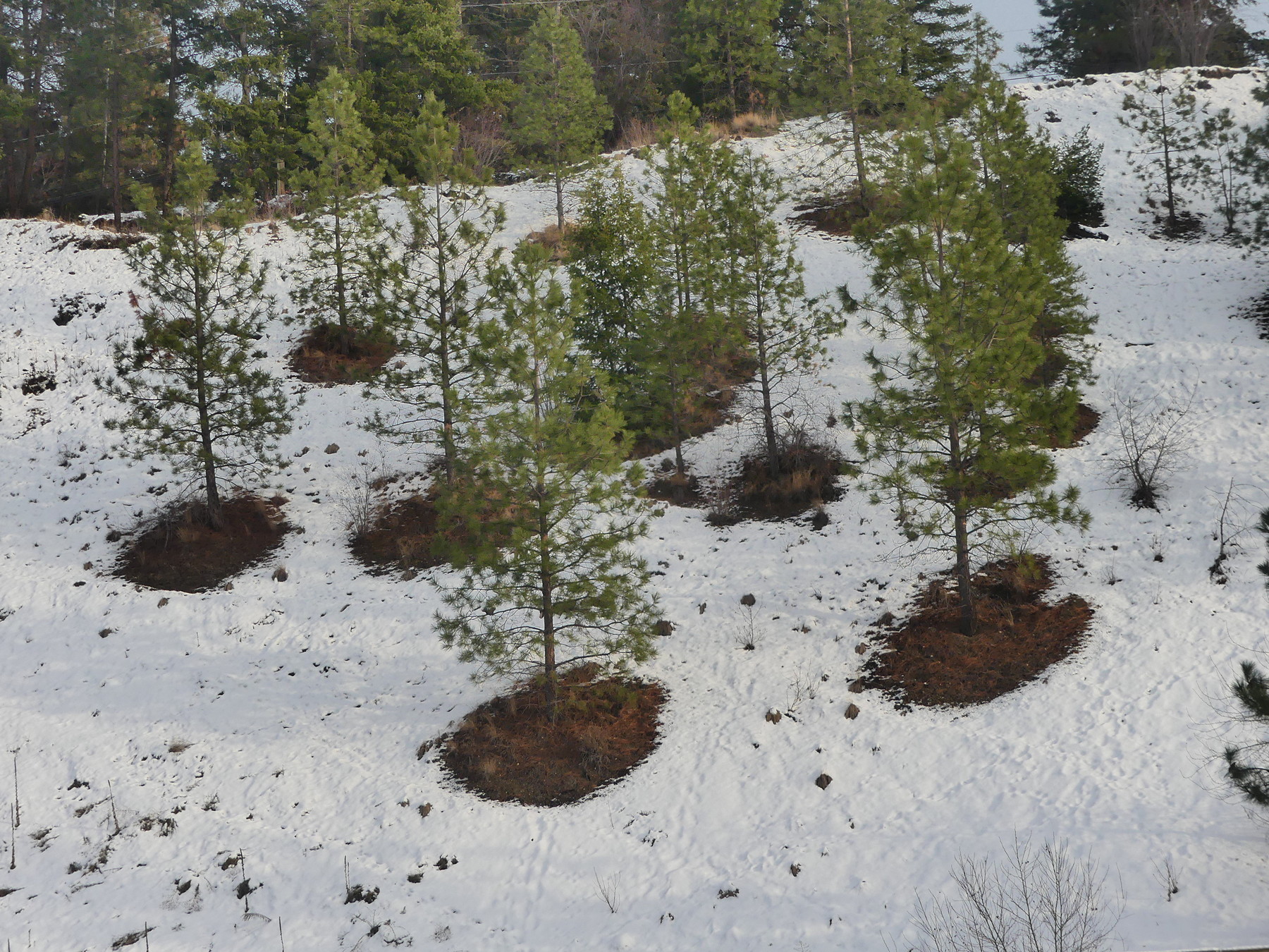 Not only is every ponderosa pine here a vertical column, rather than a star of branches as it appears to human eyes, and not only does it create a zone under its branches that differs in water harvest and temperature from the surrounding soil, but as a grove (herd?) the trees are able to complete change deer migration patterns as well. The deer normally make the tracks that cut across the slopes at 30-40 degrees. If you look closely, you’ll see them cutting across the slope. Here, though, they go vertically as well. The trees have done that. All three effects are at play at the same time. Look how the deer have been seeking out the snowless places under the trees. They too are actors in this dance. What a choreography!