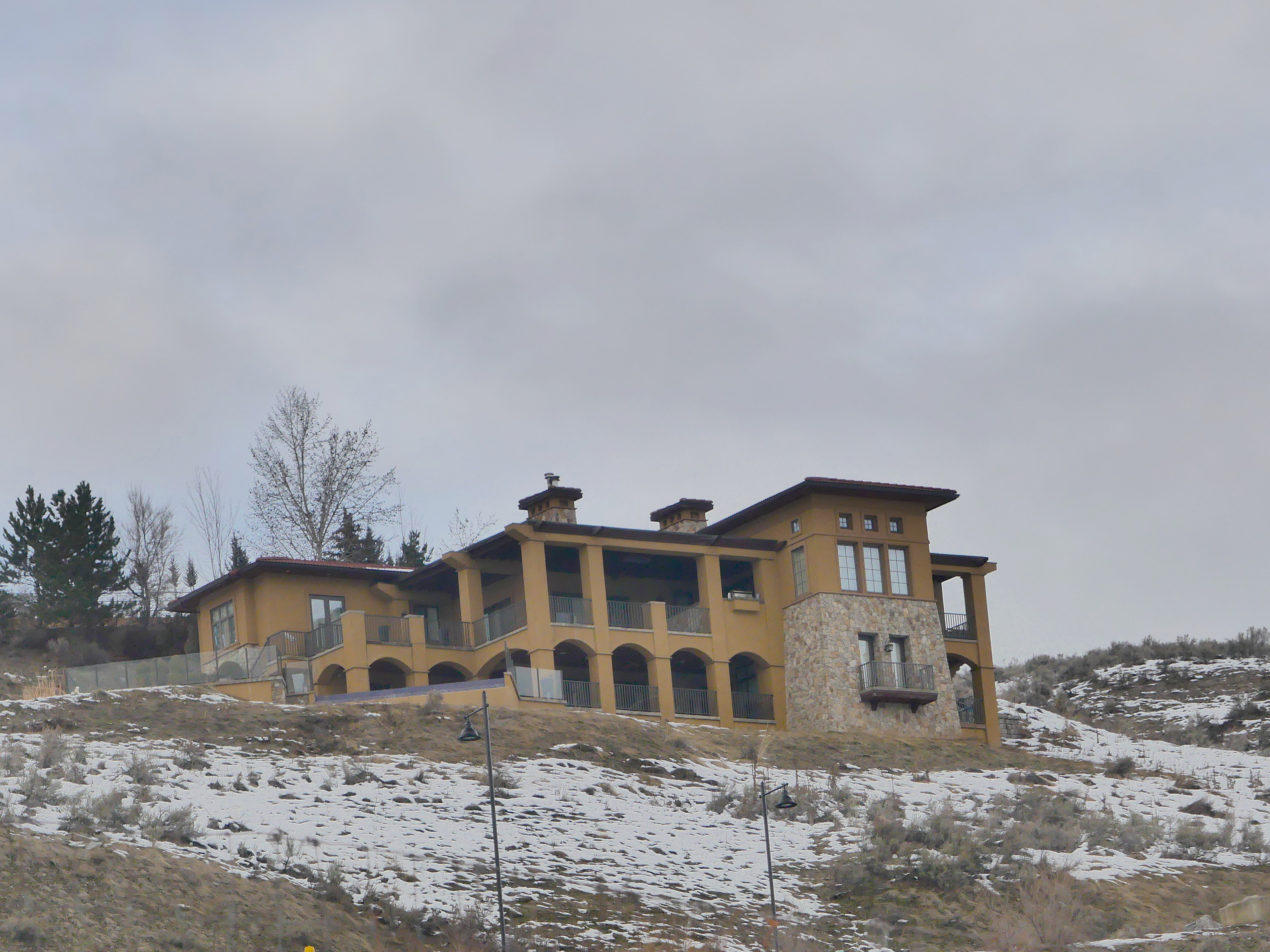 Here’s a cottage on the hill in Vernon. Sometimes there are people in it, standing on the deck, looking out over God’s Kingdom. Not often, though. Note the pair of doors for royalty to take a wave in the middle of the rock facade. Nice.