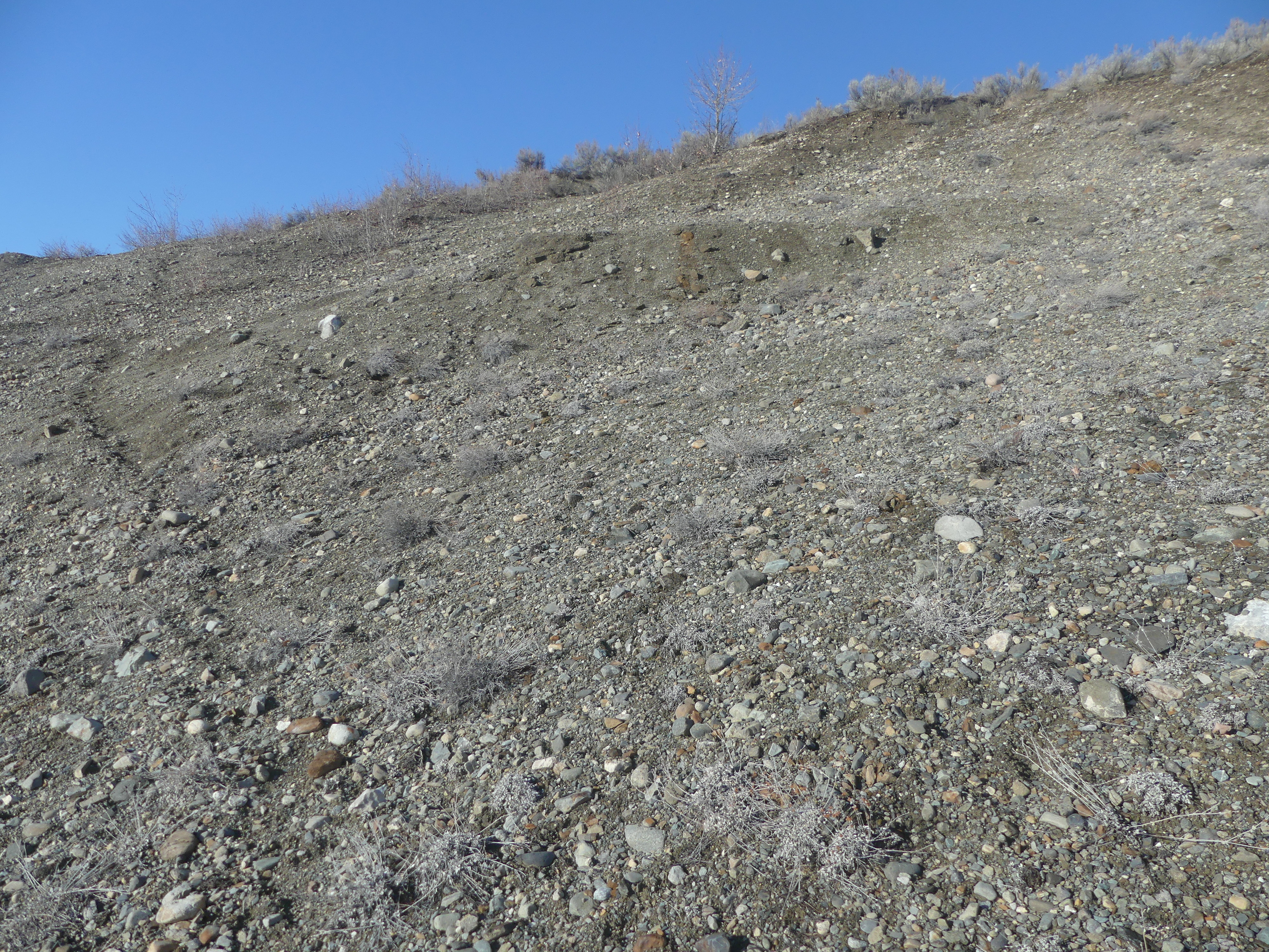 Note the mule deer trail in the left of this image, at an angle up this gravel pit. That’s a pretty normal angle for a mule deer to go up a slope.
