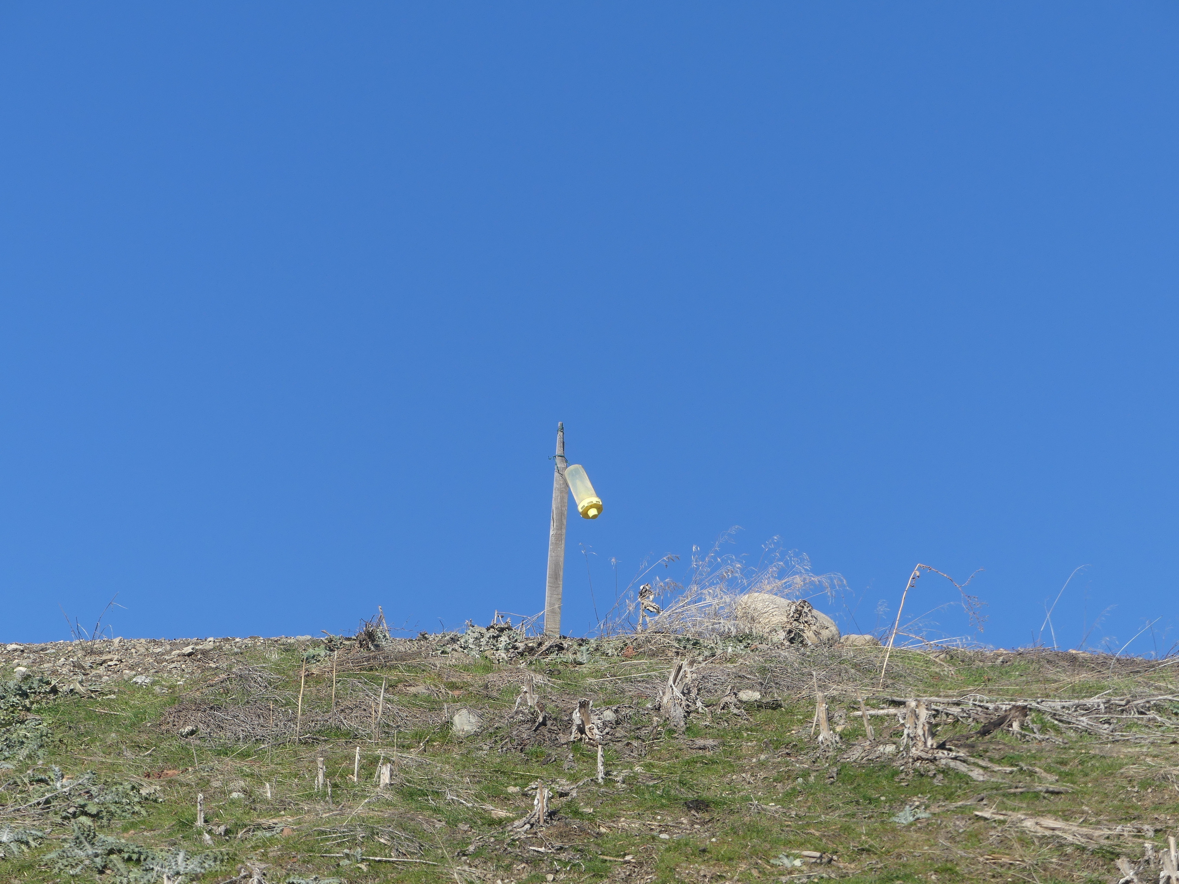 That’s a wasp trap. It’s got about 6 centimetres of wasp carcasses in its holding tank, on the edge of a vineyard. The prey is yellow jackets and invasive wasps. Trouble is, yellow jackets are vital predators in organic farming systems, there are dozens of other wasps live in the remnants of the grasslands, doing the same good work and pollinating the surrounding farms, including this vineyard. Everybody goes into the trap. No-one comes out. I sure hope that’s not why this one, the blue mud dauber…