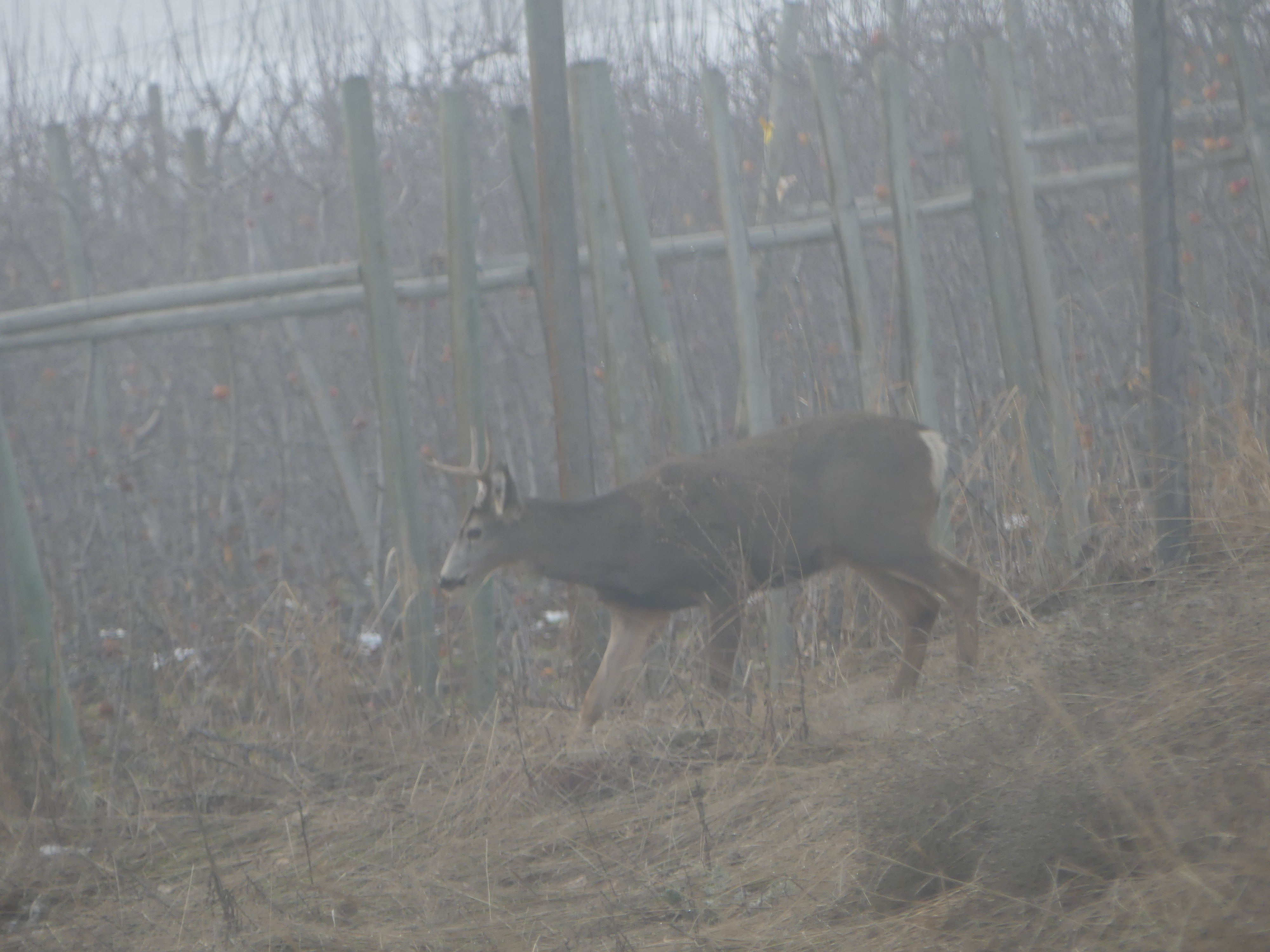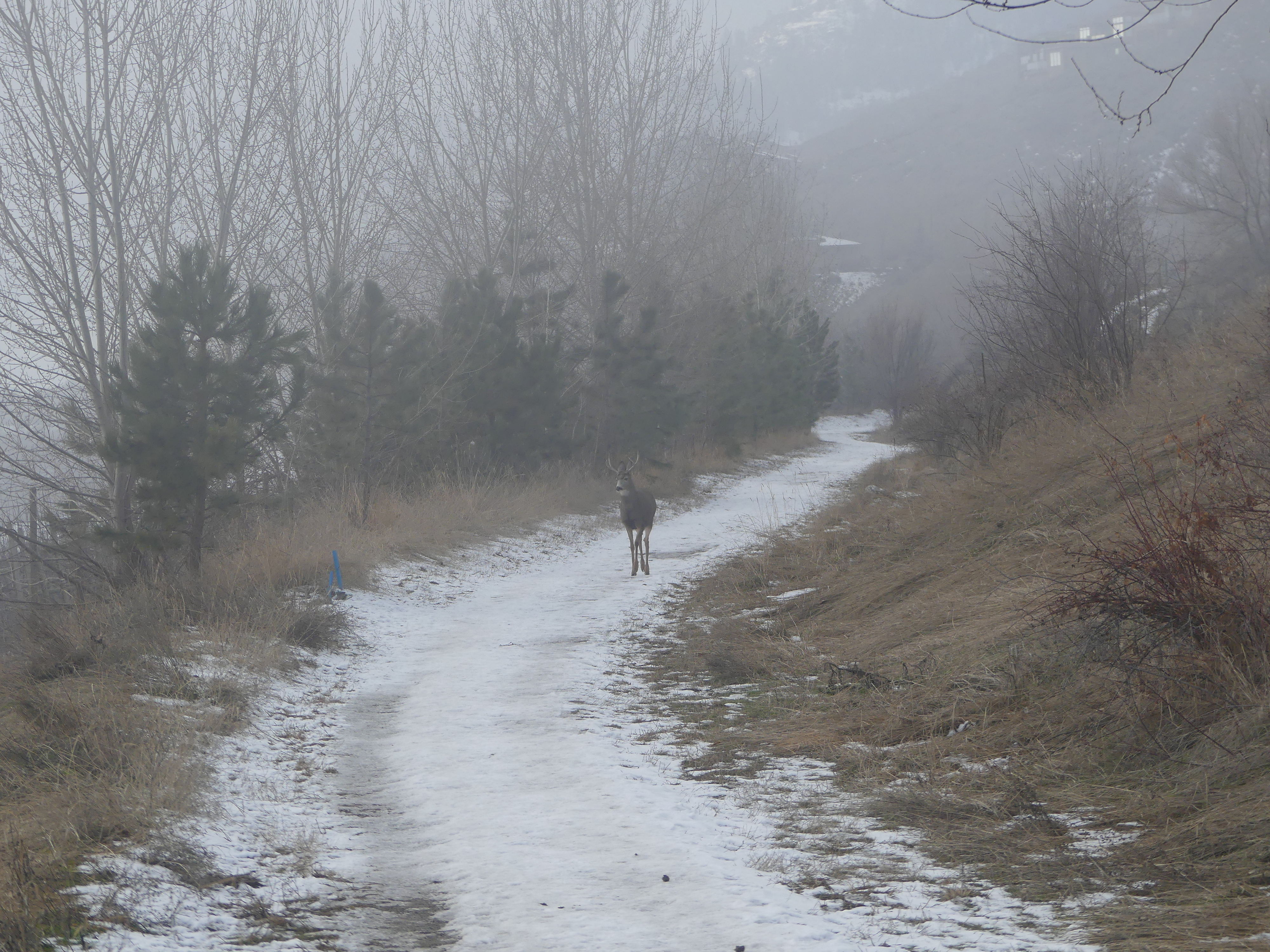 A young buck strolls along the canal trail in the fog.
