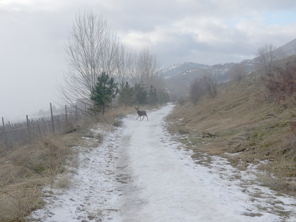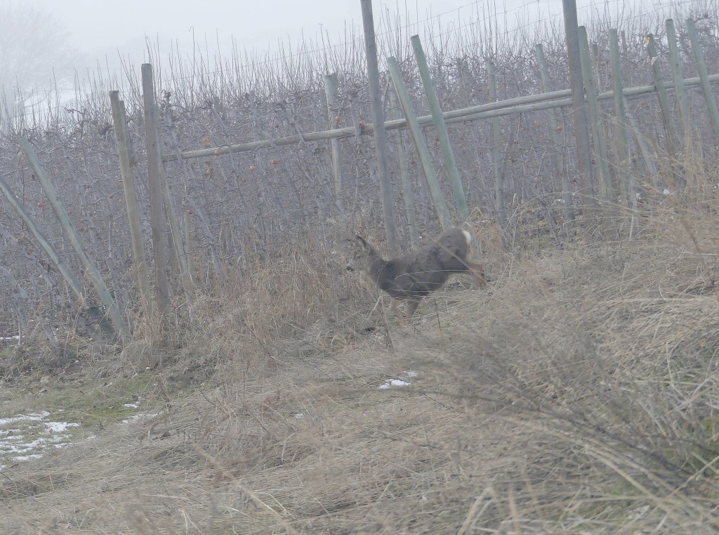 Then down to some human fruit trees and tasty shrubberies. There’s a gathering of does a kilometre away and the older bucks will be fighting over them the next afternoon.