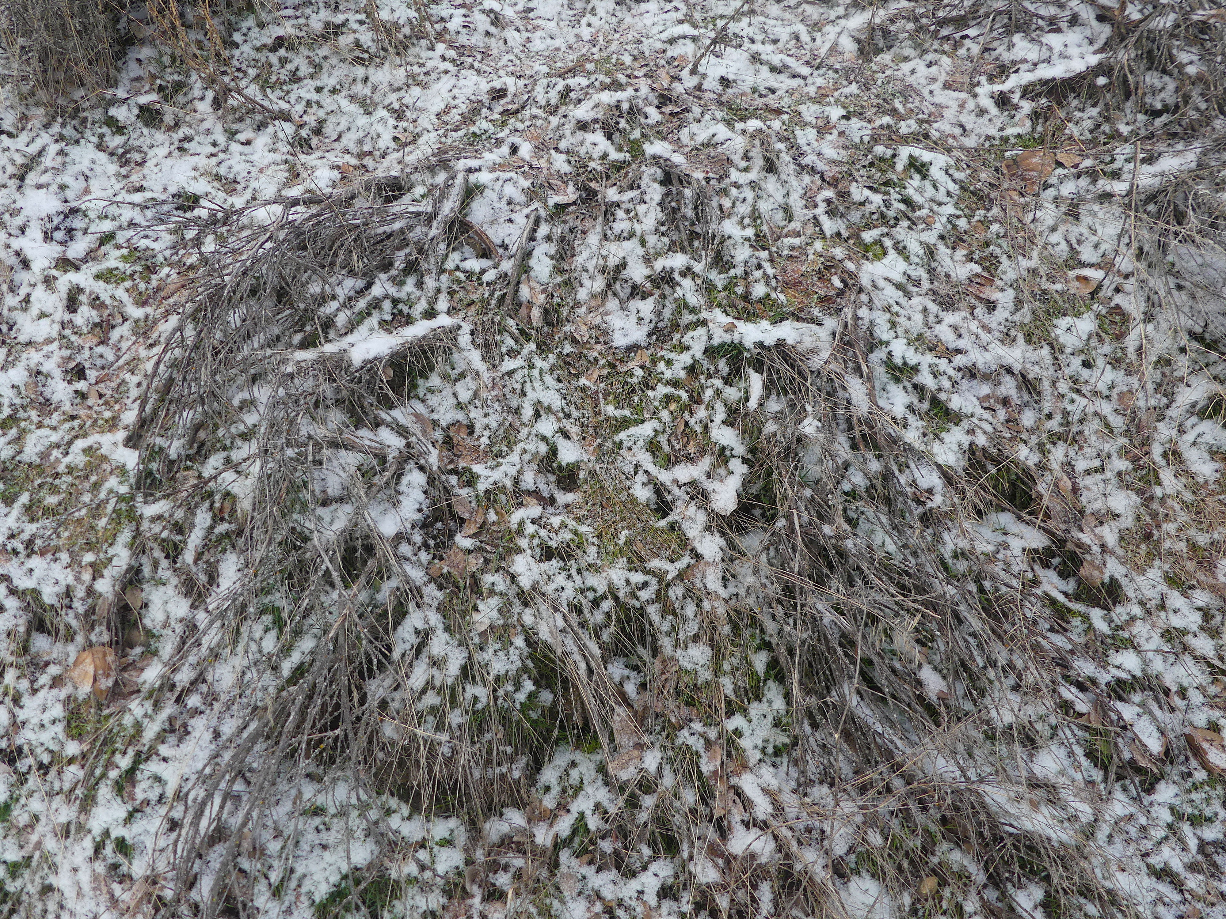 Now, look at the equally angular patterns its angular crystals (snow) make when they fall on a grassland hill. Flakes might fall evenly from the sky, but they do not distribute themselves evenly on grass.