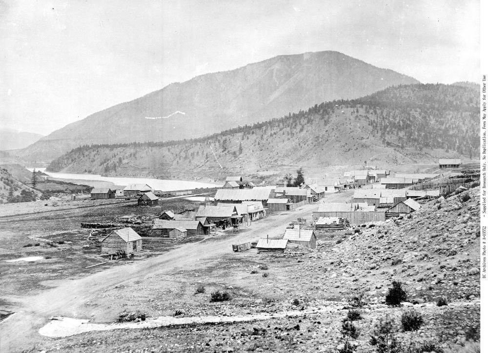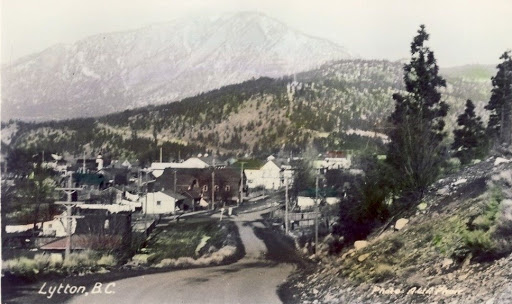 A lot of local trees went into those buildings, for sure, but likely not the ones on the banks below town or on the steep slopes leading down to the river in the distance. The slope in the foreground, for sure. Note that the flat in the centre of the image, on the bank of the Fraser River, is where Simon Fraser was met by thousands on his “discovery” trip downriver. It’s also where American militias parleyed with the Nlaka’pamux and sued for peace, before this was even a British Colony in 1858. It’s a village site, in other words. Time marches on. Here’s Lytton a generation later, now a thriving Canadian metropolis. Bit of an eroding flood coming down in the foreground.