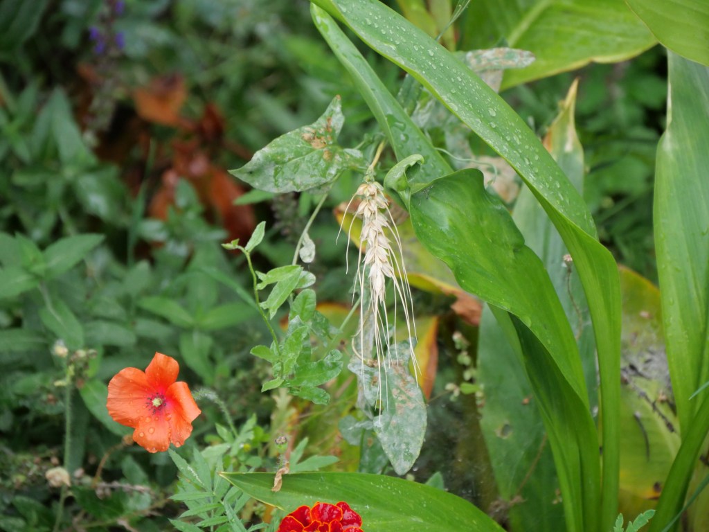 And how people interweave with that. Interweaving is not just about commercial potential. Here’s my front flower garden, with a lily for remembrance, a poppy for Iceland and for my wheat patch in the Cariboo when the kids were young and I made cupcakes from scratch (and fed a lot of mice and blackbirds along the way), bindweed because it’s bindweed and goes where it likes, some grain from the winter’s bird seed, some Cariboo mint, for memory of the Marble Mountains, and a marigold, for memory. All in all, a lot of binding of the present and the past, with seed for the future.