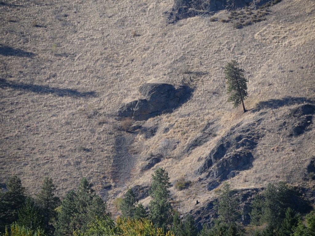 SX̌ʷƏX̌ʷNITKʷ, the second major salmon falls of the Syilx Illahie (and the only one remaining free of Grand Coulee Dam), is not alone in this light. Look at Coyote’s big knobby head up on the hill!