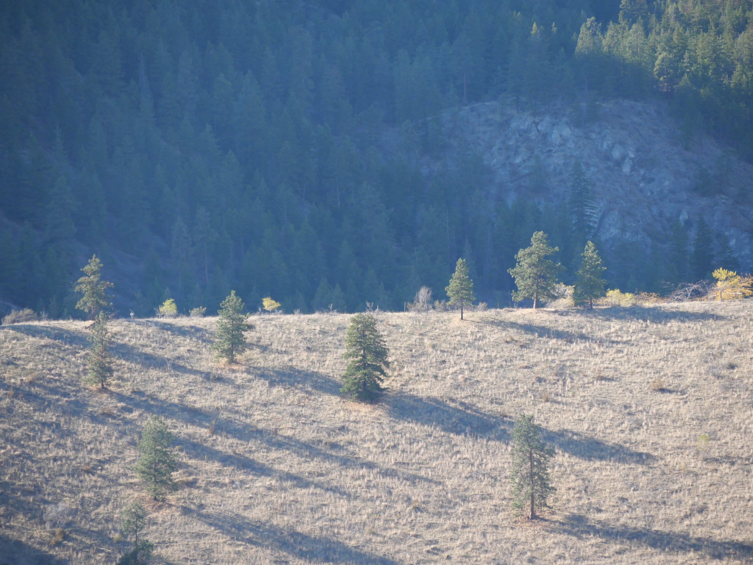 Stuff has changed, as you can see. The cut where the draining waters of the lake sliced through its bed over a couple days have now been covered in grass and a few ponderosa pines, while the old shore in the back is thickly draped with Interior Douglas-firs. On this October morning, shadows are long. One might think that soil type or elevation creates the conditions for grass instead of trees. That’s certainly true, yet it’s not the whole story. Three factors tell this story here: elevation, heat and water. Just as the sun catches this solitary pines and casts long shadows, so do the Coast Mountains far to the west cast long shadows of air pressure. In this case, it’s in reverse to the sun-shadows. The shadows of the Coast Mountains are the brightly-lit dry grass. The slopes protected from their drying effects are the forests in behind. In other words, the Sun and the Coast Mountains are working in unison to create this grassy slope. In effect, when you walk on this grassland, you are walking in the place where the sun and the mountains meet. You are, in effect, inside the mountains, projected here across hundreds of kilometres by the Sun’s energy in the open Pacific. And isn’t that what the old post-glacial lake here was doing as well? Wasn’t this the place where these dark hills caught the water the sun had melted from the glaciers created in the Coast Mountains far to the West? We look at it today and think, oh, yeah, you know, hill. Really, though, it’s energy transfer on a planetary scale. This is your Earth, and pine trees, among the stars. This is what that’s like.
