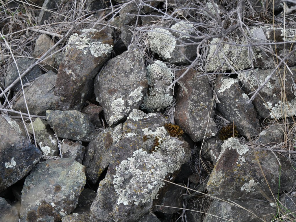These rocks roll naturally down slope and collect in hollows and gullies. The result is that they make roofs that shade seasonal streams, delivering it to plantations at their bases and sheltering many animals along the way. They also are happy places for lichen, as you can see, and as they are open, they collect heat on their surfaces, while remain cool, with good air flow below. All that has been on this blog before, but the following is new!