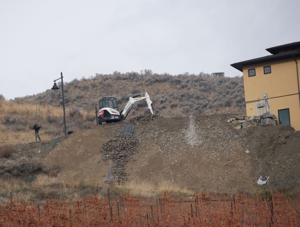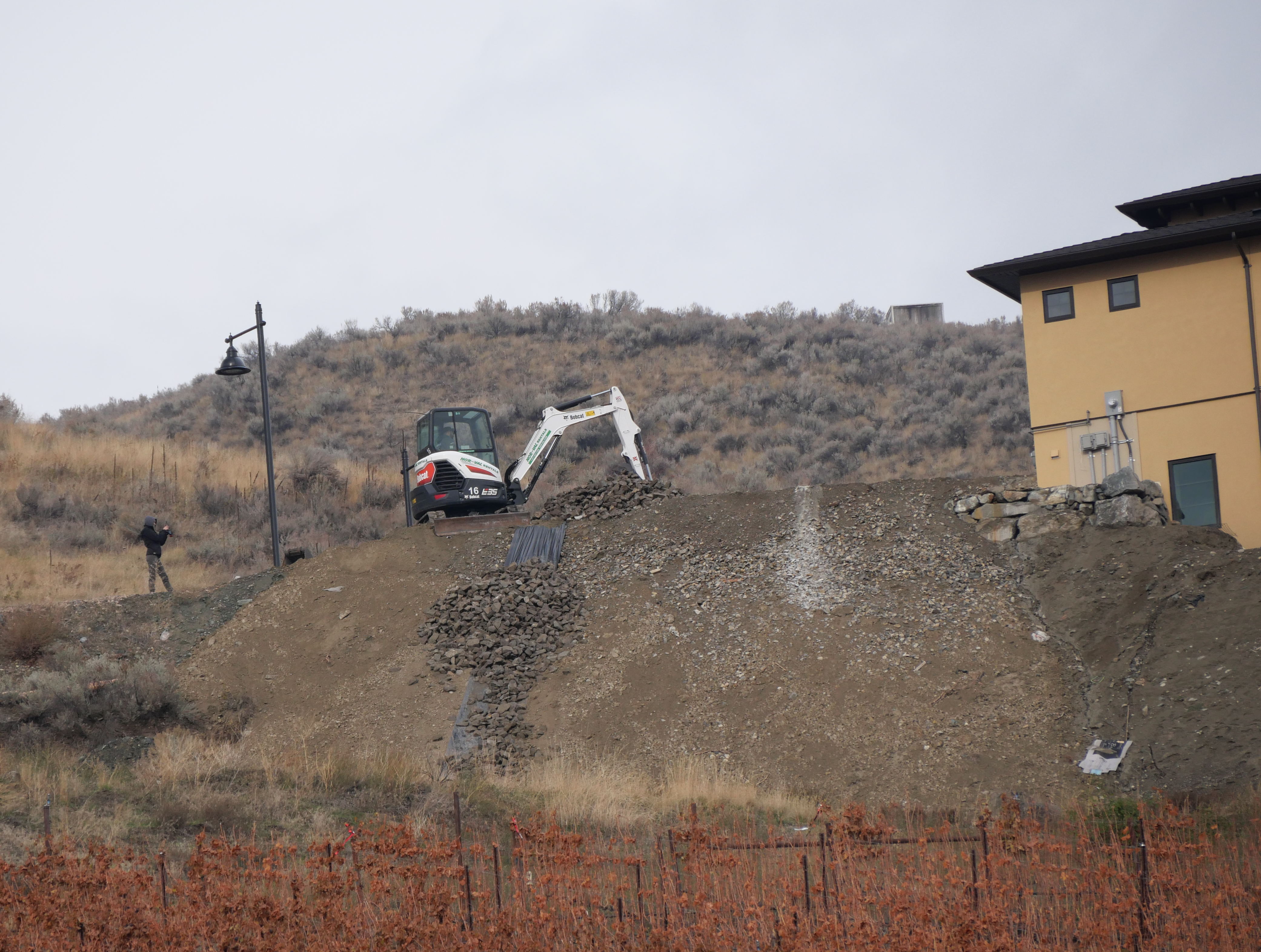 See that? right below the foundation for the posts for the balcony, the gravel wall is very nearly vertical. It will be exciting to see what they intend to lay on top of that to stabilize it and keep those foundations solid. It’s also interesting that the vertical wall has been painstakingly stepped, in little ledges of gravel that can hold about ten layers of bricks, one brick deep and just off vertical. Even more interesting, this is a view wall,. It looks straight down Okanagan Lake, to the mountains beyond. Not many windows! Not much view. The house is oriented to the right, also a view wall but over the city. Instead of facing the lake, it faces the rising sun. Seemingly, the house is built to avoid the hot summer afternoon sun. Which all suggests a few questions: why build on this lot in the first place? Why have a view when you have to hide from it? Why build a house so much too big for its lot that instead of building it down to ground level and using a terrace to shade the lower two floors, keeping both view and coolness, you build it on a vertical pile of gravel instead, and then tumble rocks down the slope to hold it magically in place?