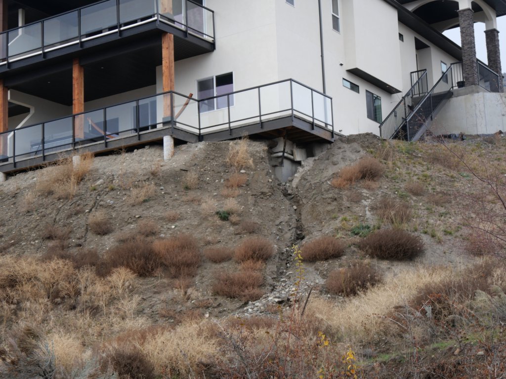 I’m guessing the plastic is to protect the soil and the rock is to slow down the flow. You might ask, hey, why not a pipe, and it would be a good question, except, you know, maybe you want someone to buy the lot next door and fill this bank in so it’s no longer your problem. This is just, like, temporary, you know, something to sell the house by giving it a modern look. However, the image below shows something more permanent.