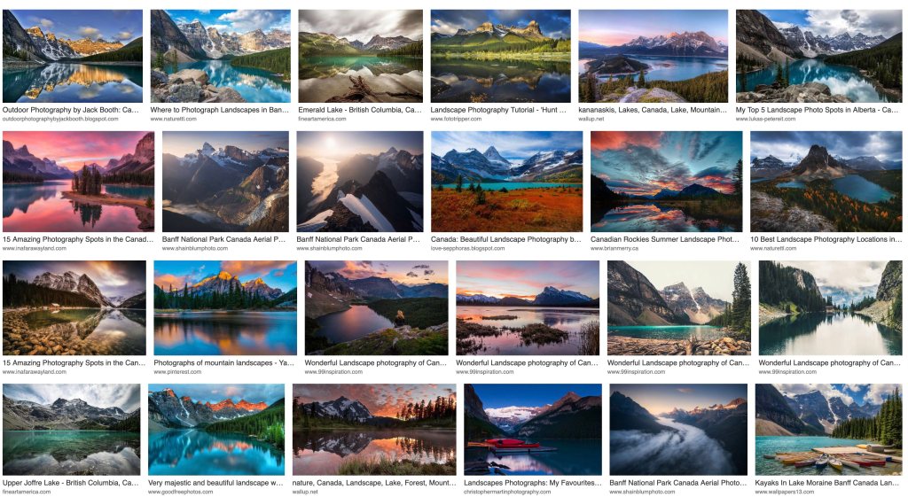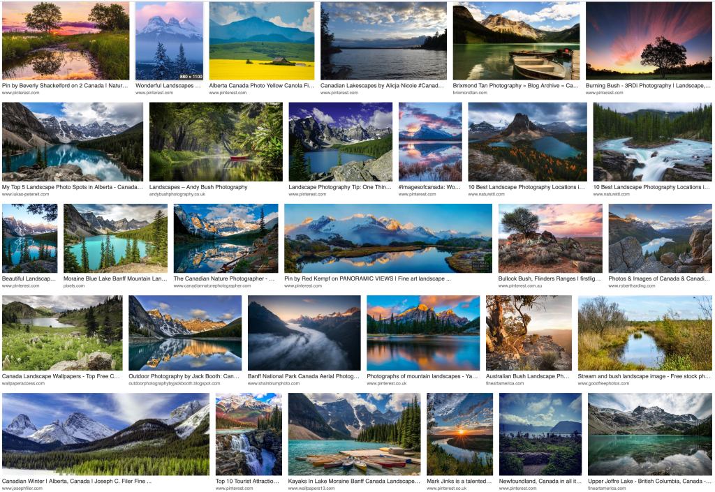 I chose to make these images in such a way as to have a sense of balance that maintained complexity and lack of a direct point of focus. It’s not entirely successful, but compare to an Internet search for “landscape Canada”. Compared to the above, this is clearly the mind on drugs.