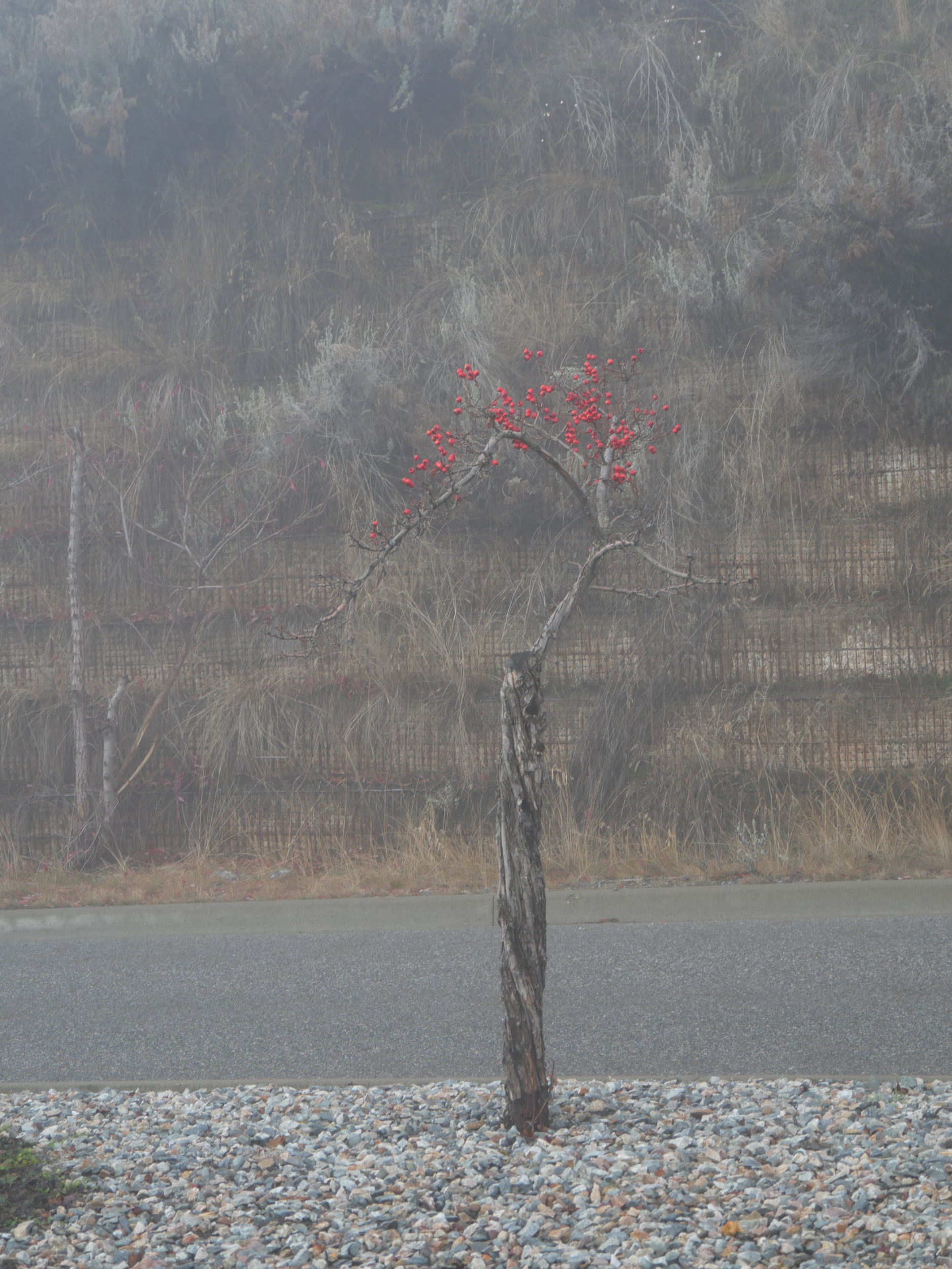 Yeah, all of its 2 dozen sisters, and all of its branches except for this one, are dead. Now, mistakes happen, but just think: no-one has come along and replanted them. More interesting yet, it was planted to be part of a landscaped boulevard, to entice people into a development that was meant to be an artwork in a grassland, with sculpted gardens, and this boulevard. They have hundreds of lots yet to sell, but no-one seems to care. Really. Look: