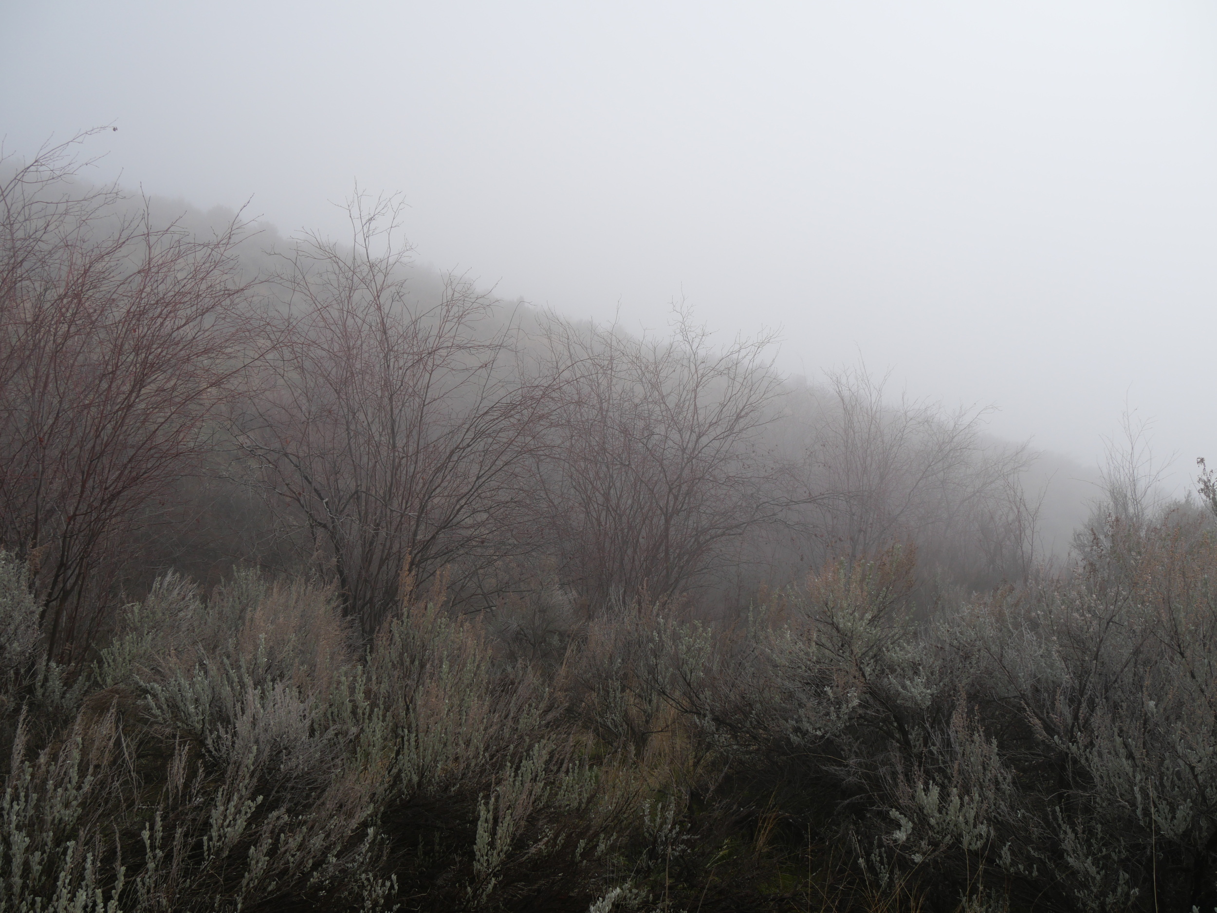 What the fog hides is that in the gulch behind them are their mothers, bushes twice their age and size, running in a line down a seasonal trickle of water. The line here follows the line below, which each bush directly above bushes below, just far enough away for birds to drop them as they fly away, always in the same direction, southwest. It must have been a good year for birds, after a good July, in which the bushes set a heavy crop, and a gentle winter and spring. It’s all remarkable, as if, all together, they took a long step uphill. Note that this configuration happens only on this wet, shaded side of the gulch. On the exposed north side, the bushes root more rarely and are ravished by deer, who like the clear, snowless spaces over there. But why the spaces between the bushes? My hunch is that they have agreed on this, root-tip to root-tip, or the birds have, responding to their mothers, who are doing it in the gully below. Whatever the case, this is a common dance pattern for these saskatoons. We would do well to listen.