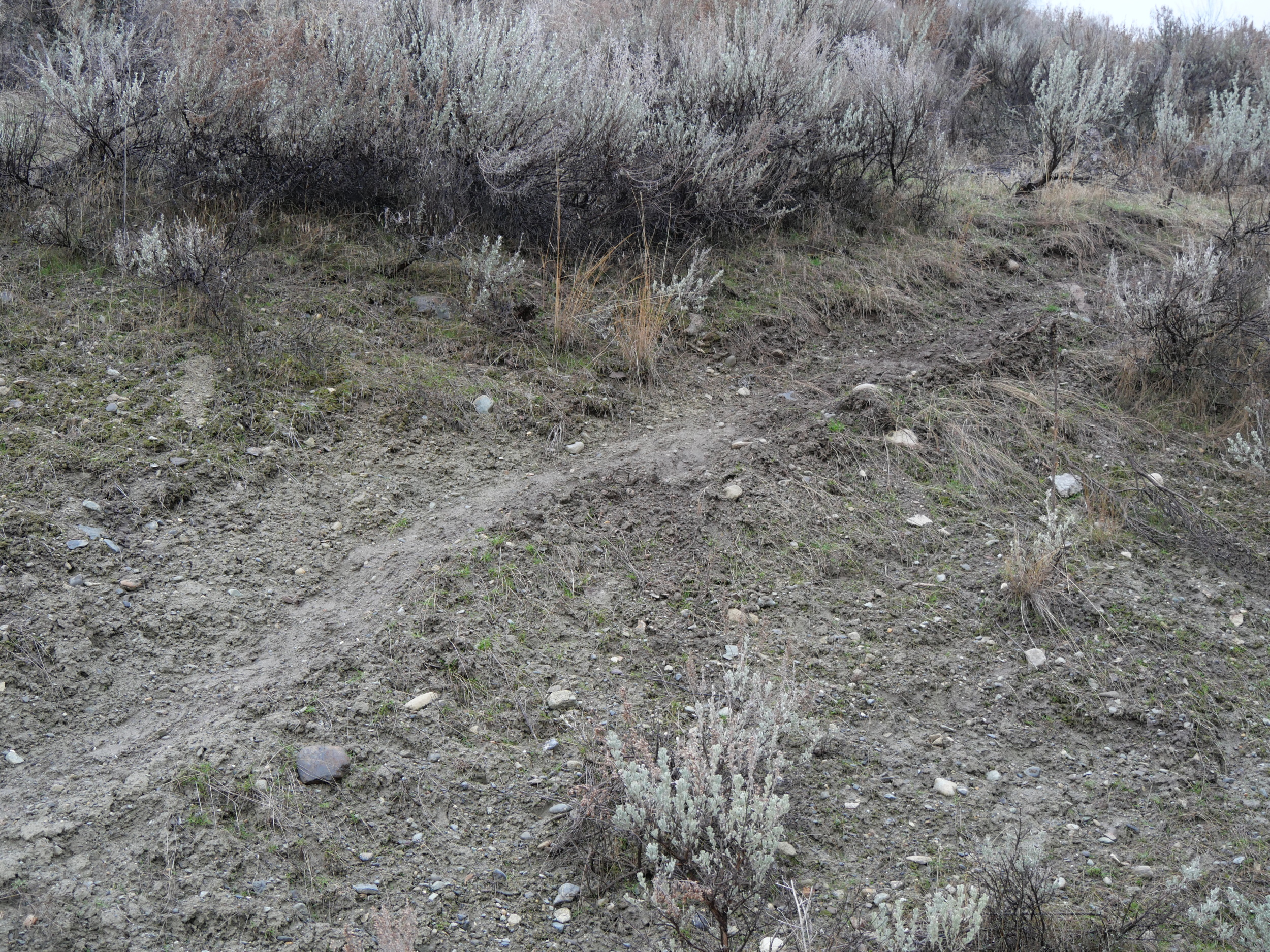 See that? They have a trail coming in from the right, the old trail in the foreground is untouched, and the upper part of the trail, above the old bulge, is churned up from some really vigorous bounding, which deer love, of course. It is also slumping from water and gravity, shifting the deer’s weight to make the trail descend the slope. In the last year, it has moved a metre down slope. That’s pretty speedy! The next image shows details of the lower part of their new trail.