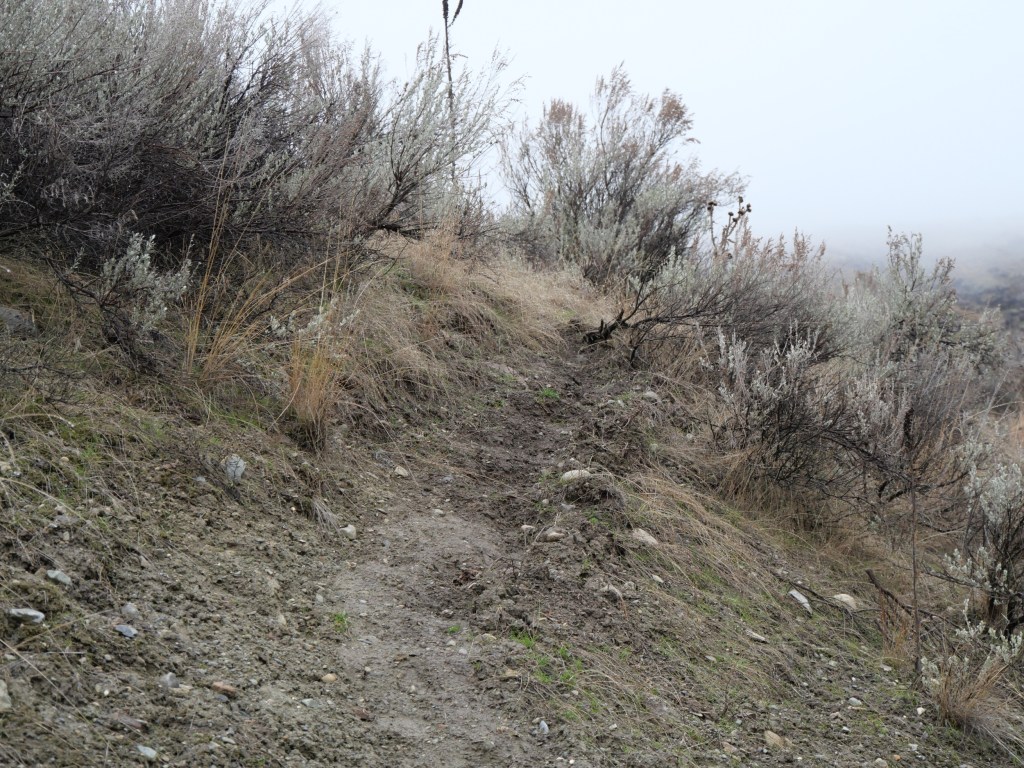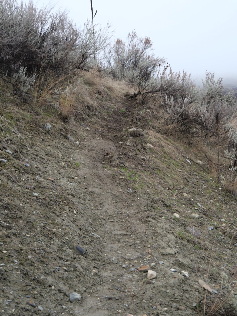 Here you can see the track of a bicycle on the lower trail, untouched by deer but still used by coyotes, quite a slump in the centre of the image, a great thing to avoid, and just below it, the new deer trail coming up from below, then bending to rejoin the upper trail, and all that bounding. I suspect the does are leading their fawns, who struggle up the steeper slope on the lower left, then bound to catch up once they make the bend, and then it’s easier going on the grass again. At this rate, in a year, the whole pressure mound of soil bulging above the centre of the image is going to be pushed further down slope, the grass will have seeded the upper edge of the churned-up trail, and the trail is going to be straight again… well, until it sags some more. It takes a team to make a trail: gravity, earth, water and deer, all together! It’s not just trails. The hills are being carved out, day to day, every day making them more closely resemble deer. And that’s beautiful.
