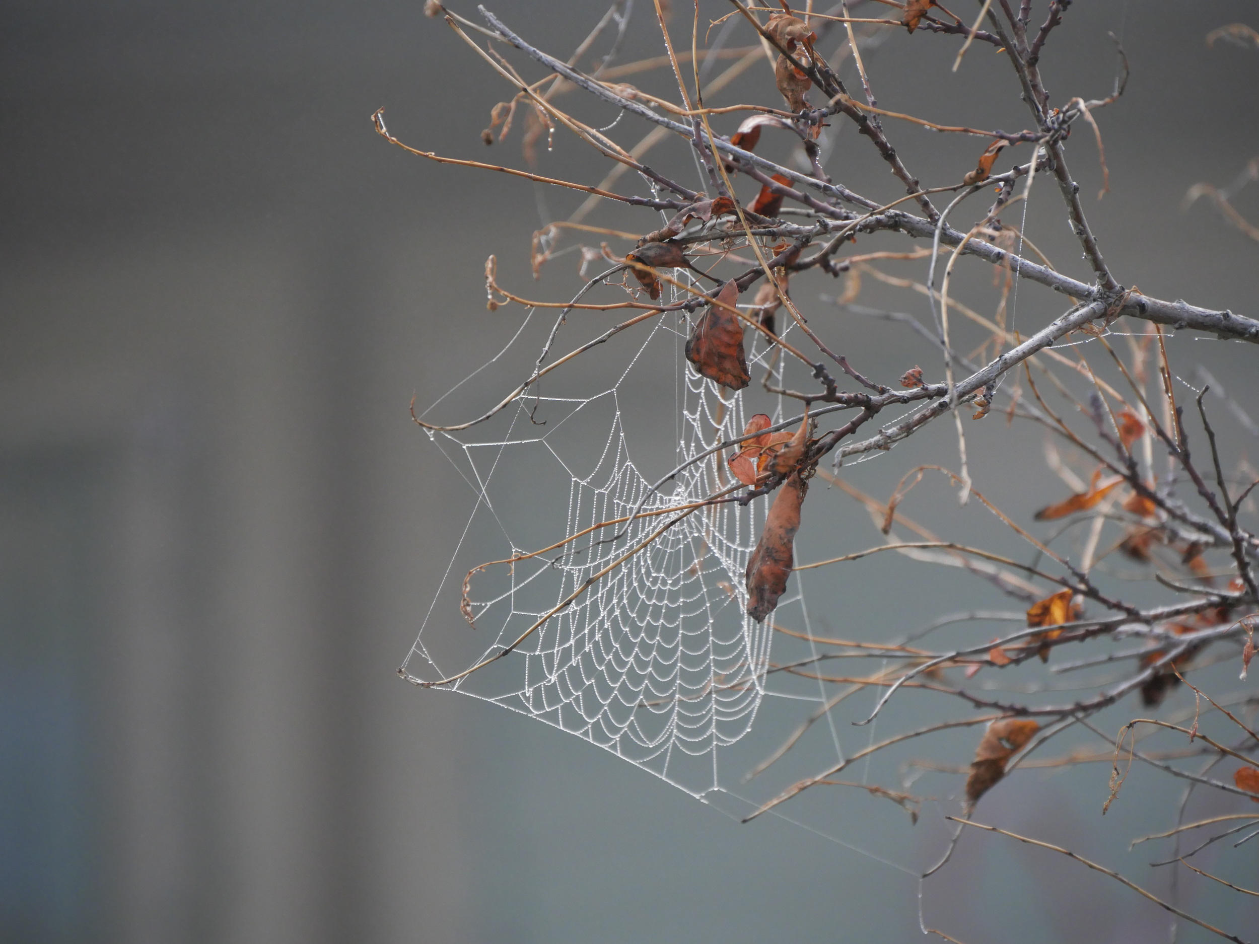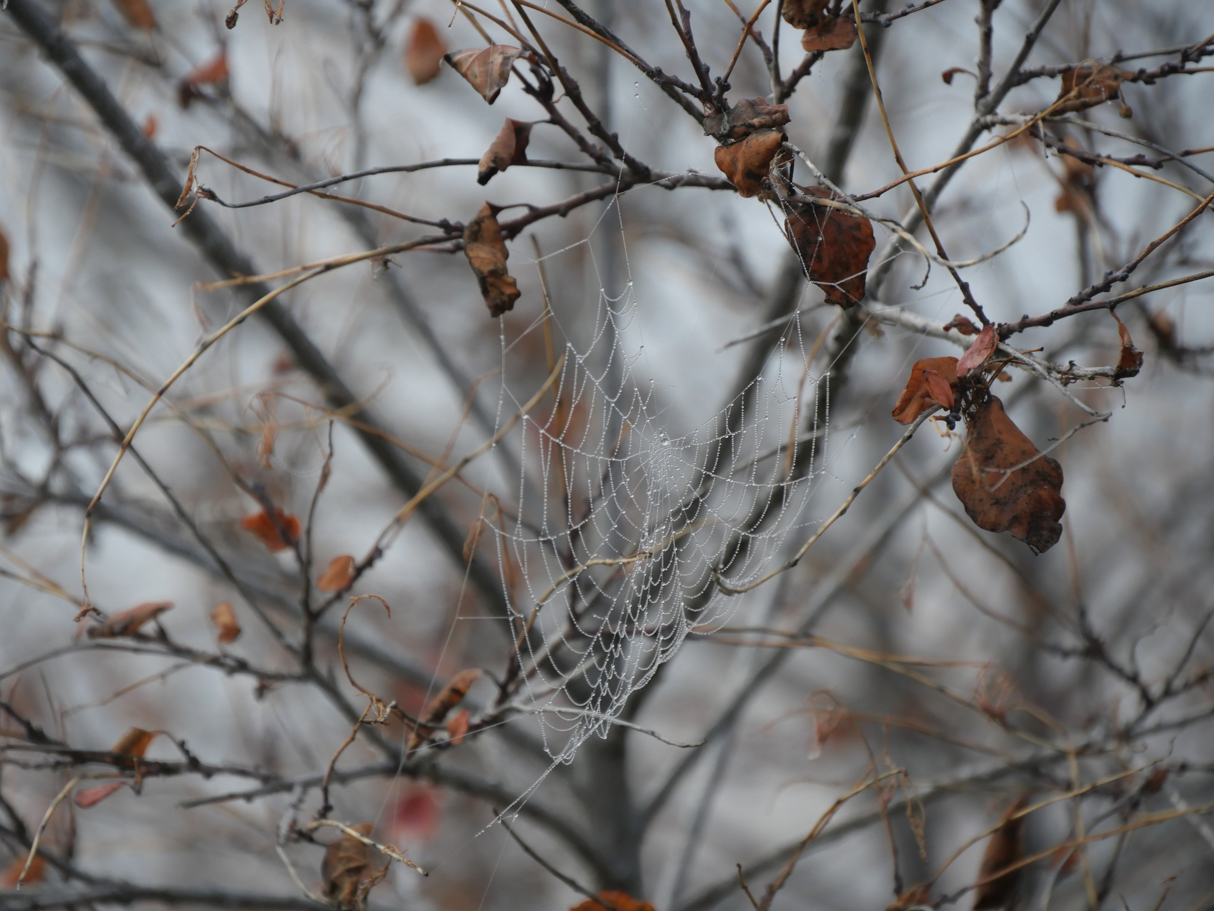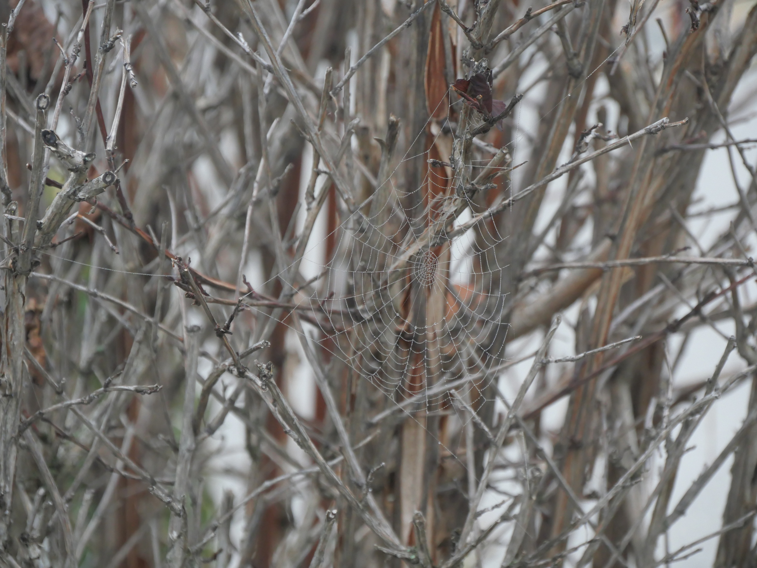 I presume that back in the good old summer time, the spider was sitting somewhere in the upper fifth of that web and along came a bird, flew into the web alone and flew out with lunch. It’s a bit of a message, I think: if you want spiders, plant flowers; if you want birds, don’t kill spiders. Here’s another. This one was never finished! Perhaps the spider was simply interrupted. Let’s hope so.