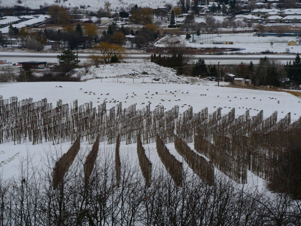 Two-newly renovated view apartments available for spring occupancy in prestigious subdivision! First-come, first-served. Rent: $0. No damage deposit required. This property lies adjacent to a popular hiking trail and has a million-dollar view over orchards, wildlife and the complex life of Vernon’s Beach and Waterfront neighbourhood. They won’t last at this price. Start planning your move today! Here’s your view. Note the Ambrosia and Royal Gala apple orchards, a wildlife refuge on an old pick-your-own tomato field, a rewilded arae on a Japanese Canadian orchard from the 1940s, a real piece of history, that, and the Vernon Creeklands below. Most of the time, the geese fill the air with musical honking, but most of the time they are in the valley bottom, leaving you to the peace of the wild cherry bushes along the Grey Canal Trail.