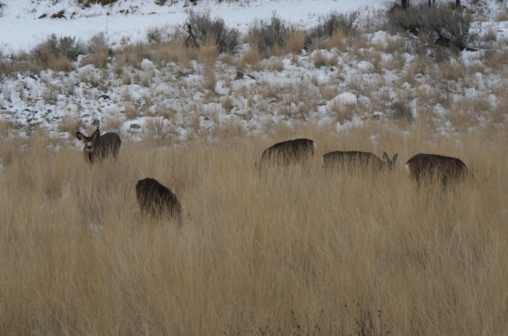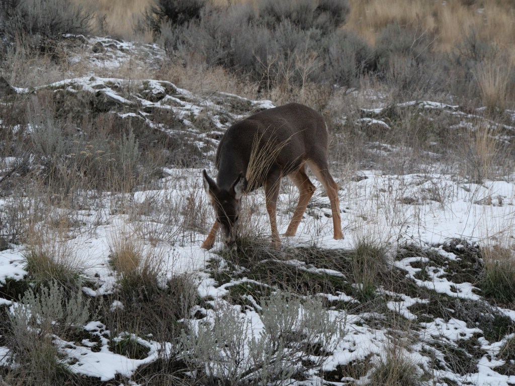 Any stories about deer herds being centred around a powerful male aren’t quite precise enough for this sociability. Here’s one of the young females showing how they’re eating the bunchgrass that has grown through the fall at the base of its stalks.