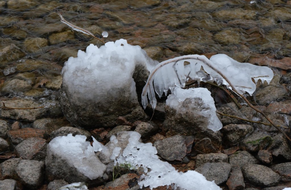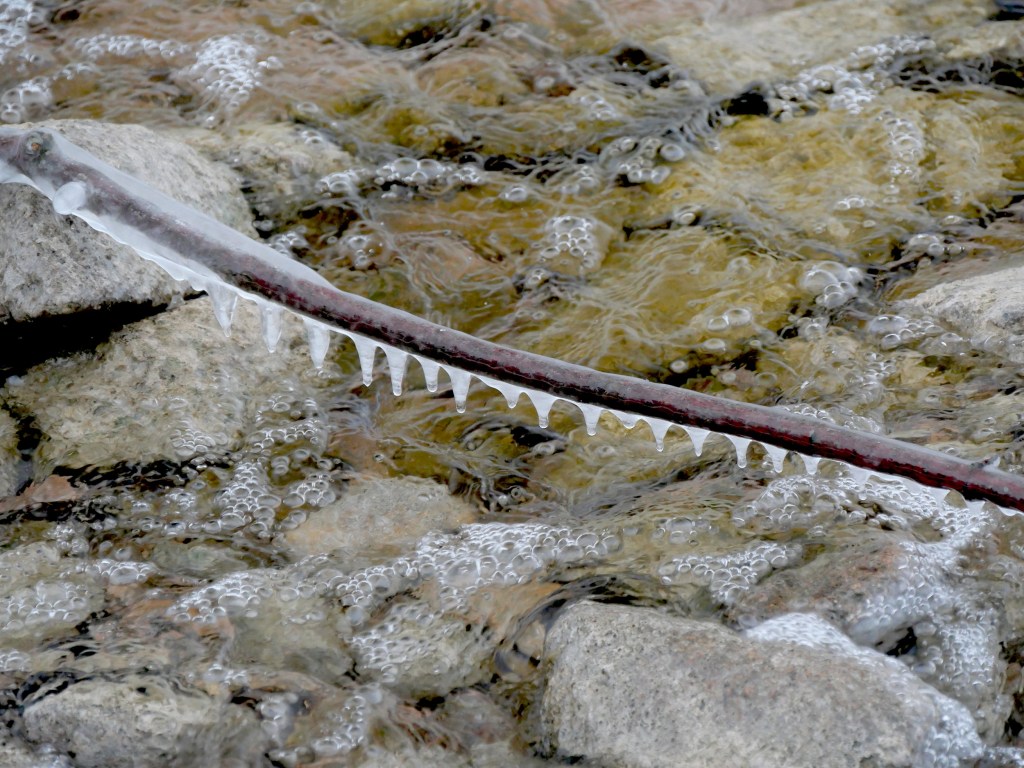 When warmer water strikes in colder air, it brings objects to life, by bringing it across a boundary of energy into a new state. It does so by moving the boundary. Rain works like this, and snow, pressed out of the air by mountains. However it comes about, the difference between the two states is held in a form that is on both sides of the energy boundary at once. This willow stick on the shore of Okanagan Lake yesterday shows the process well.