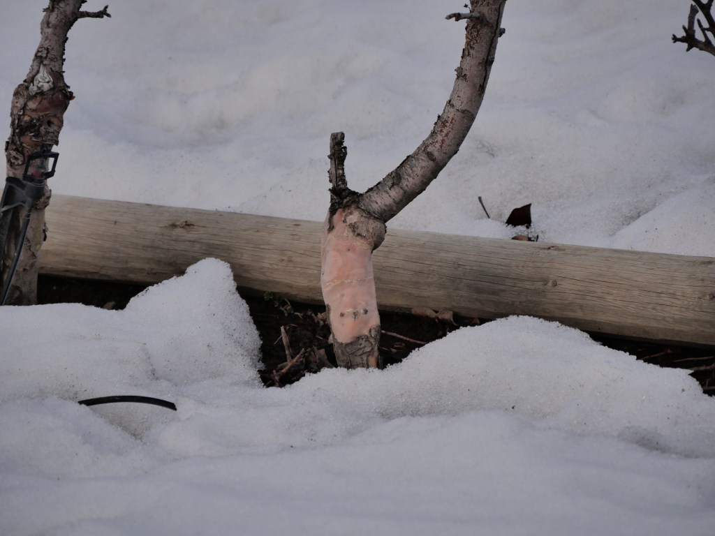 Note as well how the painted tree to the left is growing a new tree from below the graft. The anti-weedspray coating didn’t do the trick and the top has, for all useful purposes, died. Sigh. Now, remember, the fourth and fifth year are the years of highest production for this training system. Look below, and not just at the terribly high graft unions in behind.