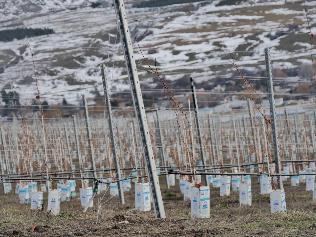 Here, milk cartons are used to provide a barrier to herbicides, there is the same high-density planting (the goal will be to take 1 or 2 bunches of grapes from each stressed plant, to get expensive quality wine out of a marginal site), the same fortune spent, and similar errors made. The plants here were still growing strongly at frost time, which did not come early. They took a beating, as you can, perhaps, see in the leaves still clinging to dead stalks. Look again: