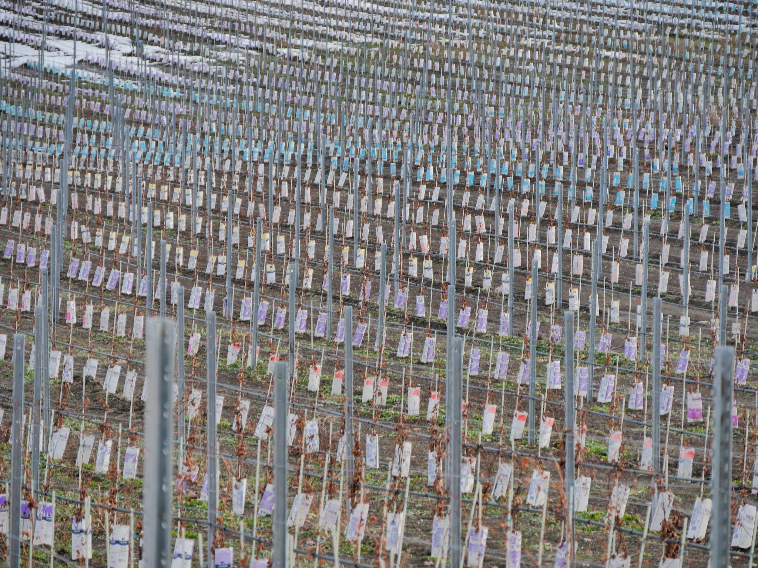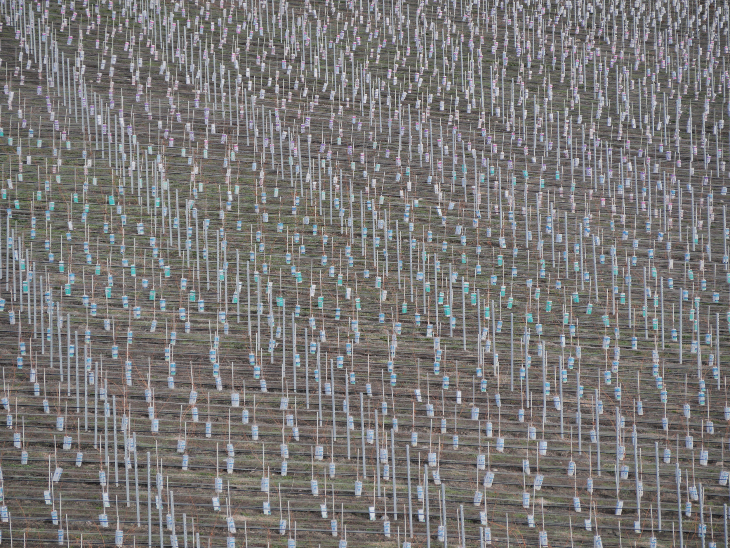 Here, milk cartons are used to provide a barrier to herbicides, there is the same high-density planting (the goal will be to take 1 or 2 bunches of grapes from each stressed plant, to get expensive quality wine out of a marginal site), the same fortune spent, and similar errors made. The plants here were still growing strongly at frost time, which did not come early. They took a beating, as you can, perhaps, see in the leaves still clinging to dead stalks. Look again: