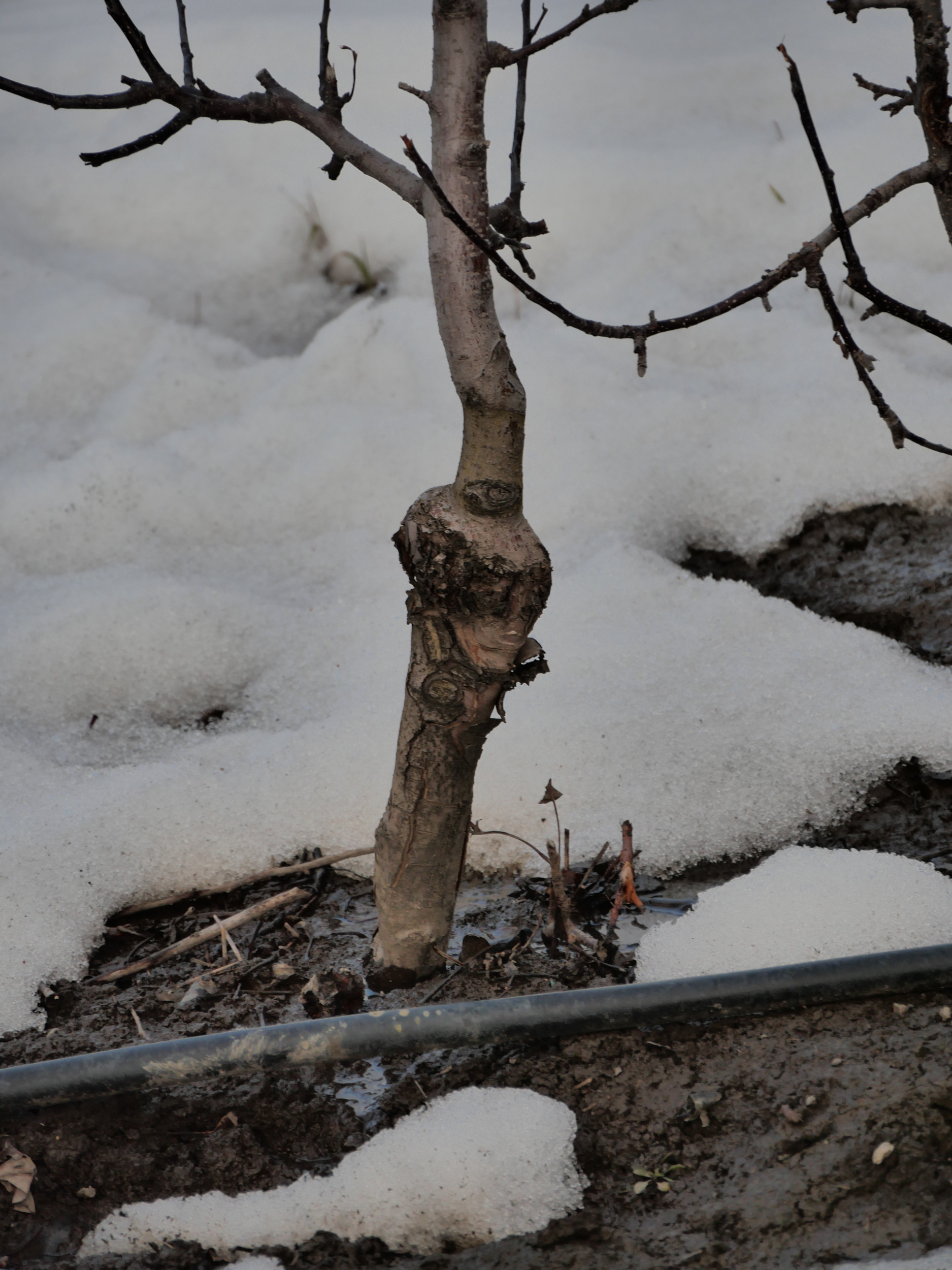 The graft on this one is even higher, with the dwarfing even more pronounced. The one below demonstrates the kind of wounds we can get in such conditions. Note that the trunk of the tree above the union has lost 30% of its potential flow due to a wound caused by poor grafting technique.