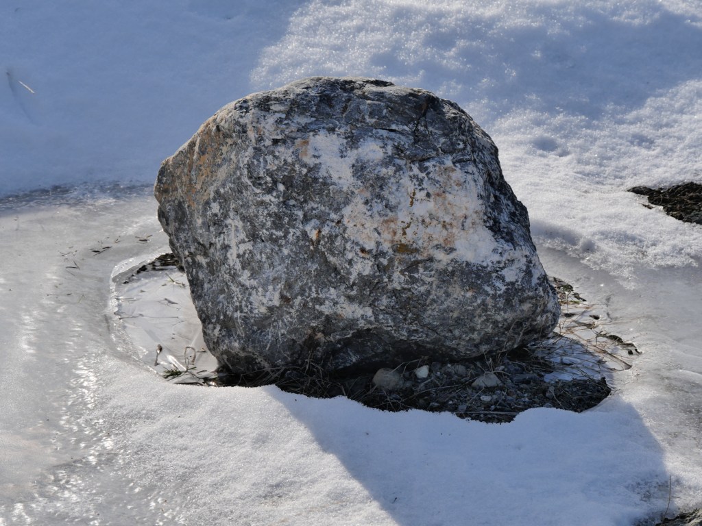 The hot rocks melt the snow, making lakes of ice, and then heat the ice, making liquid water. Over time, it evaporates or sublimates away, but if this boulder sat above a drain, it would be gathered in. This is better than waiting for spring, as far more can be gathered in this way than is currently in our climate system. Because most of the snow sublimates in the dry air, out of the 65 centimetres that fall each winter, perhaps only 10% goes into the soil in the spring, and that is largely burned away by invasive cheatgrass. This boulder is showing us the way to turn sun burnt grassland slopes into living environments, either with the water funnelling into gravity fed water systems, or being gathered in high grassland wetlands, and used to produce food from there, for us and all the other people.