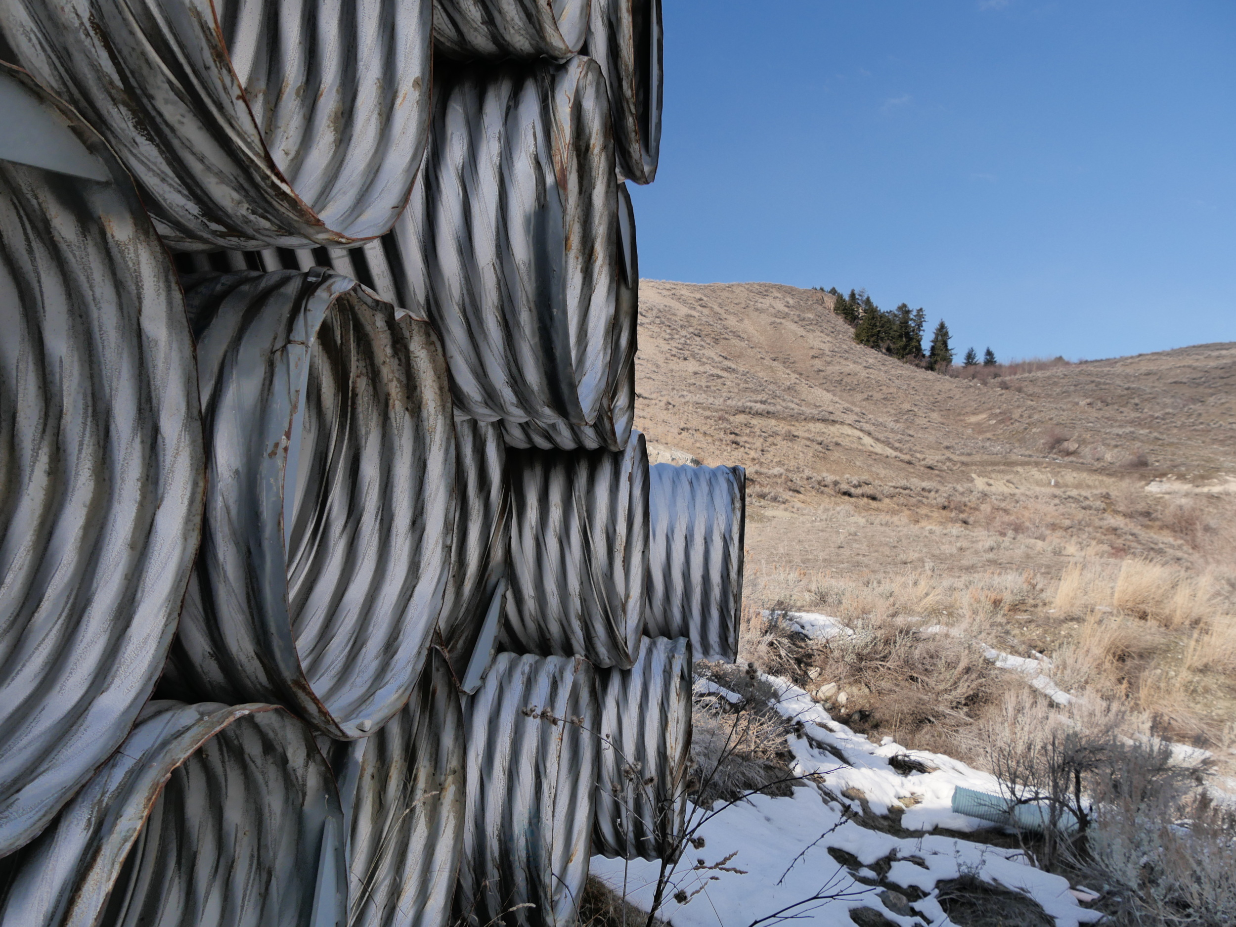 The Earth’s version is in the back. The colonial version, which turns water into a lifeless form so it can pass roads without turning them into living environments, is in the foreground, ready to be applied. Stepping forward, we get a clearer view of the Earth’s mechanisms: big eroded cuts that transfer water, and pools of water below the concentrating faces of hangs.