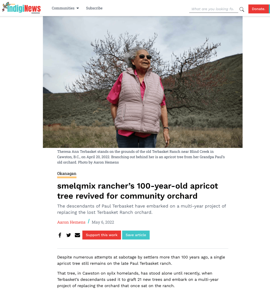 Our project to celebrate the resilience of the Sməlqmíx through friendship and an amazing apricot tree is celebrated in an article by Aaron Hemens in Indigenews. Here is elder and language keeper Theresa Ann Terbasket and her ancestral tree.
