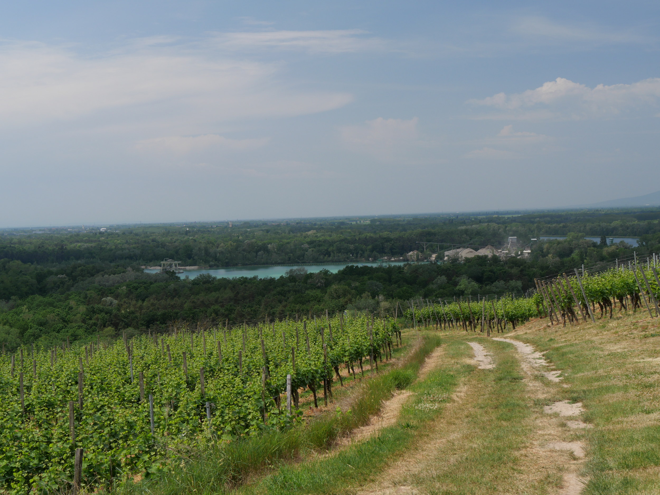 Here on the hottest part of Germany’s Kaiserstuhl, the system is managed by drought, cover crops, and manure laid in a line along the vines, after they have been treated with herbicide.