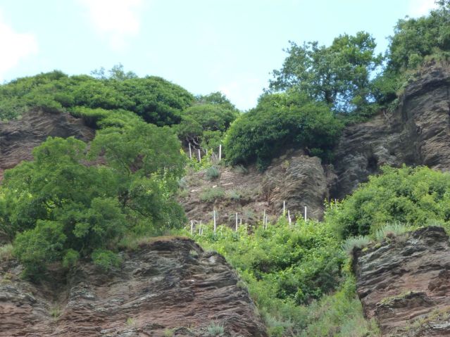 … , but it’s a trick. Here’s a more natural glimpse of grapes doing their thing in a grapey way, in the Mosel Valley, where they’ve been doing this since it was a Celtic Valley and the Romans hadn’t discovered it yet. Here, there are no stems. The grapes are hanging off a cliff, in a planting actually called a “hang”, and the grapes, naturally enough, “hang” off the vines.