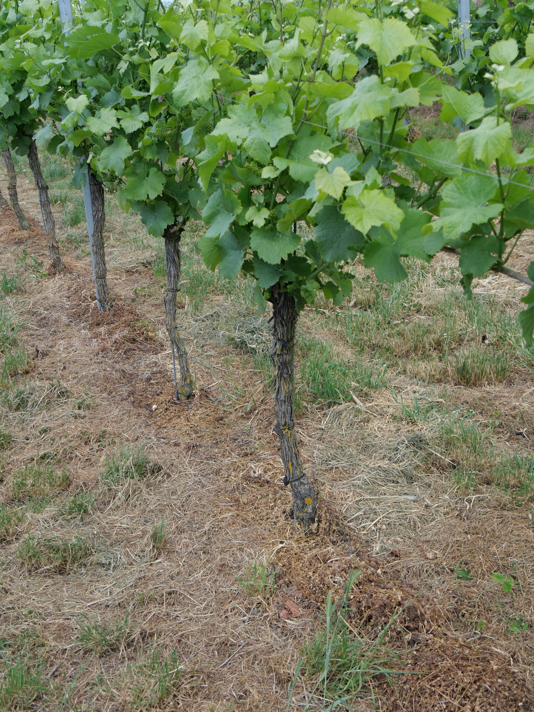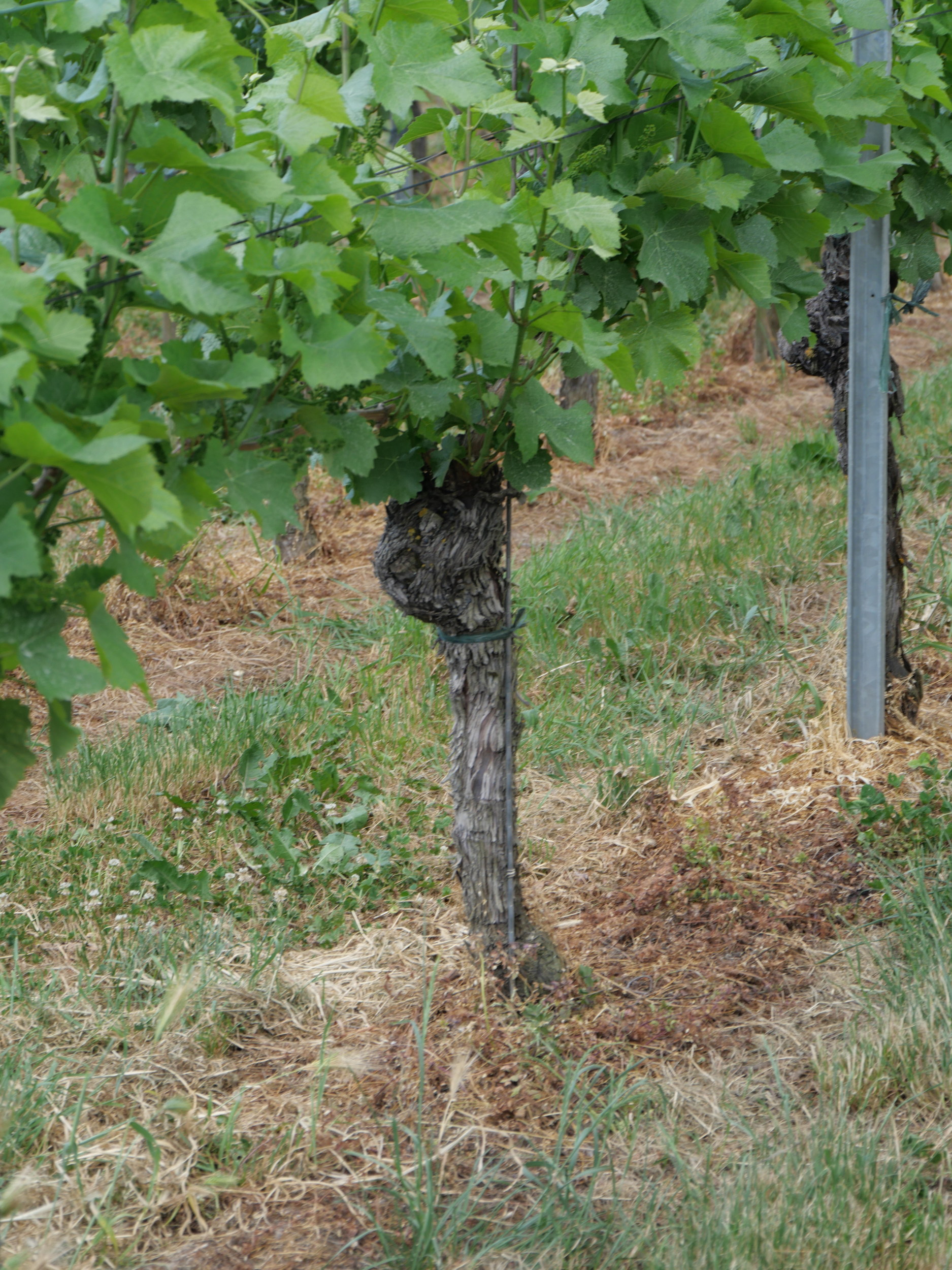 Flat, for tractor work, and spaced out and held away from the soil because of the need for grafted roots. These, however, are industrial solutions, based upon a particular image of plants that doesn’t exactly suit the ability or needs of grapes, or, might I say, the needs we have today of growing grapes without weedkillers, in order to protect populations of bumble bees, vulnerable to them. In my last post, I suggested that drought was an answer: the creation of environments resistant to weed growth. Grapes, however, need water. Not a lot, but, still, they need more than drought can provide. Either we come up with new watering technology, or we start planting grapes differently.