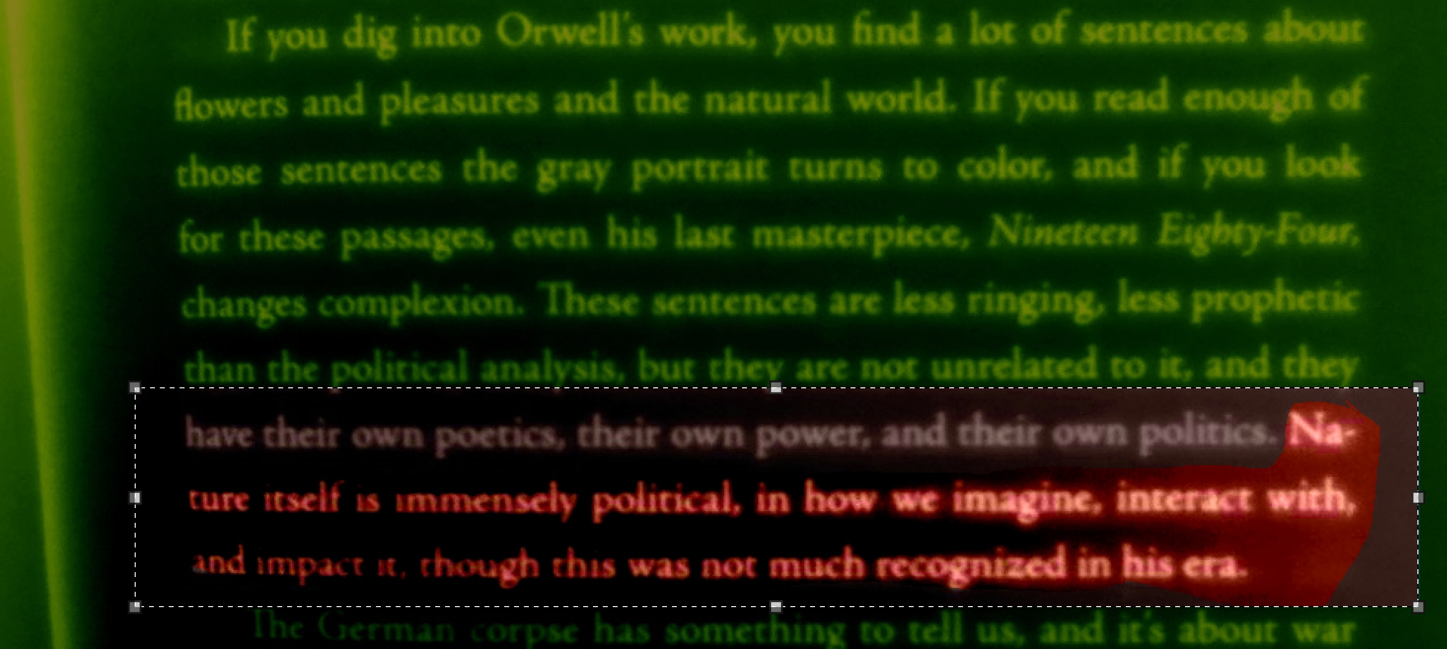 … is political, in and of itself. Otherwise, her praise of roses is only praise of Orwell’s roses, which is, like, dropping the roses altogether and saying “Orwell”. See?